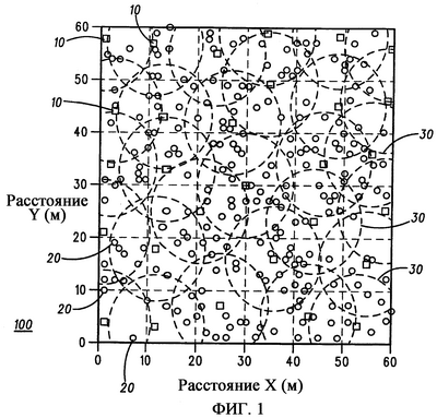 Обратимся теперь к чертежам, на которых подобные ссылочные позиции обозначают подобные компоненты. Фиг.1 иллюстрирует систему 100 связи в соответствии с предпочтительным вариантом осуществления настоящего изобретения. Система 100 связи предпочтительно использует протокол систем связи, определенный 802.15.3 IEEE (Института инженеров по электронике и радиотехнике) беспроводных персональных сетей для высоких скоростей передачи данных, однако специалисту в данной области техники должно быть понятно, что можно использовать другие протоколы систем связи, не выходя за рамки объема изобретения. Например, система 100 связи может использовать протоколы систем связи, такие как специальная дистанционно-векторная маршрутизация по требованию (AODV), динамическая маршрутизация от источника (DSR), упорядоченный во времени алгоритм маршрутизации (TORA), стандарт Bluetooth (стандарт 802.15.1 IEEE),…, и т.д., но не ограничиваясь этим. Как показано, система 100 связи включает в себя некоторое количество пикосетей, каждая из которых содержит устройство 10 согласования и большее количество подчиненных узлов 20, находящихся в связи с устройством 10 согласования. Узлы 20 представляют собой устройства, которые связываются друг с другом через синхронизацию, обеспечиваемую устройствами 10 согласования. Узлы 20 могут быть переносными (мобильными), или они могут быть установлены в данном месте.