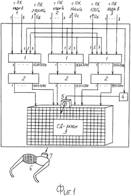 На 1-3 управляющие входы СД-дисплея с соответствующих выходов видеоадаптера ПК поступают синхроимпульсы Uк /120 Гц/ кадров, синхроимпульсы Uс /144 кГц/ строк и импульсы дискретизации Uд /230,4 МГц/. С соответствующих информационных выходов ДVI видеоадаптера ПК на 1-3 информационные входы СД-дисплея поступают в параллельном виде 8-разрядные коды сигналов R, G, В. За первый период кадра накопители 1 кодов производят накопление кодов первого кадра, по окончании которого следует выдача синхронно и параллельно всех кодов кадра в блоки 2 формирователей импульсов, а накопители 1 кодов ведут накопление кодов следующего кадра. Сигналы разрядов первого кадра параллельно поступают в свои формирователи импульсов, где формируются по амплитуде и длительности 8 мс и поступают в СД-ячейки, вызывая излучение светодиодов в течение длительности кадра. На СД-экране представляется картинка первого кадра, длящаяся 8,3 мс. По окончании длительности 1199 строк второго кадра из накопителей 1 кодов выдаются коды второго кадра в блоки 2, на СД-экране представляется картинка второго кадра. Параллельно идет накопление третьего кадра накопителями 1 кодов. Далее процессы повторяются. Объемное изображение воспринимается зрителем через ЗД-очки. В блоках 2 задействуются 46041600 однотипных формирователей импульсов /1199×1600×8×3/. Идентичность электронных схем облегчает выполнение их в интегральном исполнении. Учитывая наличие большого числа соединительных проводов между накопителями кодов и блоками формирователей импульсов и от них к светодиодам матриц в СД-ячейках /46041600×2/, заявляемый плоскопанельный дисплей, включая накопители кодов и блоки формирователей импульсов, лучше всего исполнить единой, монолитной и неразборной конструкцией и в настольных, и в мобильных вариантах.