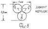 Напряжение питания 3 В с источника 17 питания через открытый ключи 16 запитывает светодиоды 10, которые излучают каждый с длительностью, соответствующей величине своего кода. Прогресс вычитания в счетчиках 14 импульсов длится до появления кода 00000000. С приходом в дешифратор 15 кода из одних нулей он выдает сигнал Uз, закрывающий оба ключа и 13 и 16. Питание светодиодов прерывается, излучение прекращается. Длительности излучения светодиодов 10 воспринимаются соответствующими уровнями яркости излучаемого ими цвета. Излучения трех светодиодов трех СД-ячеек проходят цветные светофильтры R, G, B, и поступают на экранное стекло, формируя изображение пиксела соответствующего цветового тона. Скважность излучений всех светодиодов экрана 3 за период кадра /10 мс/ и формирует яркость цветовых тонов всех пикселов, которые в совокупности составляют изображение кадра на экране 3. При разрешении 1920 отсчетов в отроке и 1200 строк в кадре матрица экрана 3 содержит 2304000 элементов /1920×1200/ или 6912000 СД-ячеек, следовательно, содержит 6912000 светодиодов белого свечения. Из процесса формирования изображения на экране исключаются строчная и кадровая развертки, процесс построения изображения упрощается, но при этом требуется обеспечение каждого светодиода своим преобразователем “код – длительность излучения”. Современные технологии позволяют изготавливать микросхемы с десятками миллионов транзисторов [7 с.65], следовательно, каждый из блоков 1 и 2 будут изготовлены в одной микросхеме. Диаметр светодиода 10 принимается 0,5 мм /фиг.8/, размер элемента матрицы /трех СД-ячеек/ составляет 1×0,8 мм. Толщину экрана 3 составляет толщина экранного стекла /СД-ячейки размещены внутри стекла/, которая будет 5-7 мм ширина двух строк 1,6 мм /фиг.9/. Размер экрана 3 составит: по горизонтали 1920×1 мм=1920 мм, по вертикали 1200×0,8 мм=960 мм, по диагонали 2146 мм или 84,5 дюйма. Максимальная яркость свечения светодиода с силой света 3,5 кд при диаметре излучающей части 0,5 мм составит: