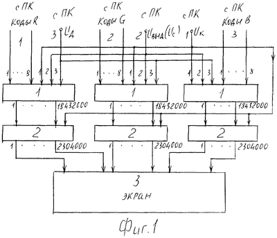 С информационных пиковых выходов видеоадаптера ПК на информационные входы накопителей 1 кодов кадра в параллельном виде поступают 8-разрядные коды сигналов R, G, В. С управляющих выходов видеоадаптера ПК на первый, второй и третий управляющие входы накопителей 1 кодов кадра поступают синхроимпульсы частоты кадров Uк, частоты строки Uc и импульсы Uд дискретизации видеорежима соответствующего разрешения /таблица/. За время первого кадра регистры блоков 4 последовательно заполняются кодами первого кадра. Каждый блок 4 сосредотачивает коды одной строки. При первом режиме разрешения 1024×768 кодами заполняются блоки 4 регистров о первого по 768 /фиг.2/, при втором режиме разрешения 1280×1024 заполняются блоки 4 с первого по 1024, при третьем режиме разрешения 1920×1080 заполняются блоки 4 с первого по 1080-й, при четвертом режиме разрешения 1600×1200 заполняются блоки с первого по 1200.