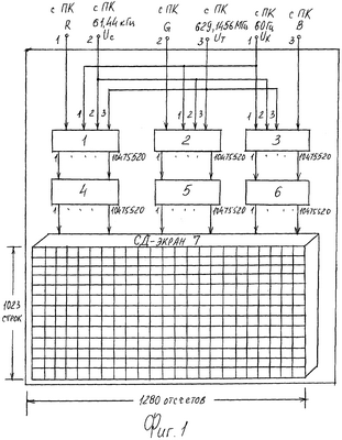 С соответствующих выходов видеоадаптера ПК на информационный вход накопителя 1 кодов поступают в последовательном виде 8-разрядные коды сигнала R, на информационный вход накопителя 2 кодов поступают коды сигнала G, на информационный вход накопителя 3 кодов поступают коды сигнала В. С соответствующих управляющих выходов видеоадаптера ПК на первый, второй и третий управляющие входы накопителей 1, 2, 3 кодов поступают соответственно синхроимпульсы /60 Гц/ частоты кадров, частоты строк 61,44 кГц и тактовая частота UT /629,1456 МГц/. За время первого кадра регистры 12 /фиг.3/ последовательно заполняются кодами первого кадра. Каждый блок 8 регистра сосредотачивает коды одной игроки, поэтому их в каждом накопителе кодов по 1023, по числу строк в кадре без одной. За кадр в каждом накопителе кодов накапливаются по 10475520 кодов. Управляющий импульс с последнего блока 81023 регистра поступает на четвертые управляющие входы блоков 8, выдает из них синхронно и параллельно все коды в блоки 4, 5, 6 формирователей импульсов и обнуляет разряды регистров 12 для приема следующего кадра. Время 1024-й строки /16,27 мкс/ используется на выдачу кодов в блоки 4, 5, 6, на обнуление разрядов регистров 12 и начало срабатывания схем формирователей импульса. В течение кадра /16 мс/ идет неменяющееся по яркости излучение СД-ячеек, а на СД-экране неменяющаяся картинка изображения. По заполнению 1023 блоков 8 регистра кодами второго кадра следует параллельная выдача кодов в блоки 4, 5, 6. На экране 7 в течение 16 мс воспроизводится картинка второго кадра. Далее идет повторение этих процессов.