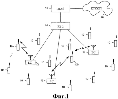 На фиг.1 представлена блок-схема весьма упрощенной сотовой системы телефонной связи, в которой может быть использовано настоящее изобретение. Беспроводные терминалы 10 (в типовом случае сотовые телефоны) располагаются вокруг базовых станций 12. Беспроводные терминалы 10а и 10b находятся в активном режиме и поэтому взаимодействуют с одной или несколькими базовыми станциями 12 с использованием радиочастотных (РЧ) сигналов, модулированных в соответствии со способом обработки сигнала в режиме множественного доступа с кодовым разделением каналов (МДКР) стандарта IS-95. Система и способ обработки РЧ сигналов, по существу согласованные с использованием стандарта IS-95, описаны в патенте США №5103459 на «Систему и способ для формирования сигналов в сотовой системе телефонной связи режима МДКР», переуступленном правопреемнику настоящего изобретения (далее патент ‘495). Остальные беспроводные терминалы 10 находятся в дежурном режиме и поэтому контролируют наличие сообщений поискового вызова, указывающих на запрос установления связи.
