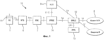 Узел 12 сервера определения местоположения может обеспечивать информацию определения местоположения клиенту 8. Клиент 8 является логическим функциональным узлом, который формирует запрос в узел GMLC 12 на получение информации, которая относится к одной или более мобильным станциям сотовой системы. Клиент 8 службы LCS может быть узлом, который является внешним относительно сети PLMN. Клиент может также быть внутренним клиентом (ILCS), т.е. находиться в любом узле (включая мобильную станцию) в сети PLMN. Клиент имеет право получать, по меньшей мере, некоторую часть информации, относящейся к местоположению (или предыстории местоположения) мобильной станции 1.