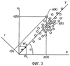 Первоначально, входящие стереофонические сигналы L и R выпрямляются и фильтруются фильтром нижних частот, что приводит к сигналам огибающей p(k) для L и q(k) для R, соответственно, где p(k) и q(k) соответствующим образом дискретизированы и индекс выборки обозначен k. Таким образом, вектор х(k)=(р(k),q(k)) обозначает вектор входящего сигнала. Альтернативно, сигналы L и R могут использоваться непосредственно, т.е. без фильтрации, или могут использоваться другие фильтрованные версии L и R, например, фильтрованные фильтром верхних частот сигналы L и R. На фиг.3 некоторое число точек сигнала проиллюстрировано как окружности. В качестве примера указаны точка x(k) сигнала и ее соответствующие компоненты p(k) и q(k). Согласно изобретению сигналы поворачиваются в направлении главного компонента векторов сигнала. В примере по фиг.3 это соответствует направлению y, где является углом между направлением у и направлением р. Весовой вектор w=(wL,wR) указывает направление главного компонента, и повернутые компоненты x(k) обозначены через y(k) и r(k), соответственно.