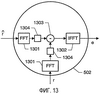 Фиг.13 показывает схематичный вид схемы вычитания для использования с вариантом осуществления изобретения. В вышеприведенных вариантах осуществления по фиг.5, 8, 9 и 12, параметры фильтра определяются путем сравнения целевого сигнала с оцененным сигналом, т.е. посредством сигнала ошибки е, служащего показателем разности между r и , сгенерированной схемой вычитания 502. Понятно, что схема вычитания может генерировать различные меры разности между r и , например, разность может быть определена во временной области или в частотной области. Со ссылкой на фиг.13 схема 502 может содержать схемы 1301 для преобразования сигналов r и , соответственно, в частотную область, например, путем выполнения быстрого преобразования Фурье (FFT). Результирующие частотные компоненты могут быть дополнительно обработаны соответствующими схемами 1304. Например, различные частоты могут быть взвешены различным образом, предпочтительно согласно свойствам системы аудитории, в результате чего разности в слышимом диапазоне частот получают больший вес. Другие примеры дополнительной обработки схемами 1304 включают в себя усреднение по заранее заданным частотным компонентам, вычисление величины комплексных частотных компонентов, кластеризацию частотных компонентов и т.п. Например, в предпочтительном варианте осуществления кластеризация выполняется перед вычитанием в частотной области. Эта кластеризация может быть выполнена с использованием блока фильтров, например, с линейным или логарифмическим поддиапазонами рабочих частот. Альтернативно, кластеризация может быть выполнена с использованием так называемого эквивалентного прямоугольного диапазона рабочих частот (ERB) (см., например, “An introduction to the Psychology of Hearing”, Brian Moore, Academic Press, London, 1997). Способ эквивалентных прямоугольных диапазонов рабочих частот кластеризует диапазоны рабочих частот, которые соответствуют фильтрам аудиторий, например, так называемые критические диапазоны частот. Согласно этому варианту осуществления соответствующая величина ERB как функция центральной частоты, f (в кГц), может быть вычислена согласно ERB=24,7 (4,37 f+1). Все еще со ссылкой на фиг.13, схема 502 дополнительно содержит схему вычитания 1303 для вычитания обработанных частотных компонентов. Альтернативно, преобразованные сигналы, генерируемые схемами 1301, непосредственно подаются в схему вычитания 1304 без дополнительной обработки. Разностный сигнал, генерируемый схемой вычитания 1304, подается в схему преобразования 1302 для преобразования сигнала ошибки обратно во временную область, например, посредством осуществления обратного быстрого преобразования Фурье (IFFT). Альтернативно, разностный сигнал в частотной области может использоваться непосредственно.