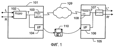 Кодирующее устройство 101 содержит кодер 102 для кодирования стереофонического сигнала согласно изобретению, причем этот стереофонический сигнал включает в себя компонент L сигнала и компонент R сигнала. Кодер принимает компоненты L и R сигнала и генерирует кодированный сигнал Т. Стереофонический сигнал L и R может происходить из набора микрофонов, например, через дополнительное электронное оборудование, такое как оборудование микширования и т.д. Эти сигналы могут быть далее приняты в качестве выхода от другого стереопроигрывателя, через эфир в качестве радиосигнала или посредством любых других подходящих средств. Предпочтительные варианты такого кодера согласно изобретению будут описаны ниже. Согласно одному варианту осуществления, кодер 102 подключен к передатчику 103 для передачи кодированного сигнала Т через канал 109 связи к декодирующему устройству 105. Передатчик 103 может содержать схемы, подходящие для обеспечения передачи данных, например, через проводной или беспроводной канал 109 передачи данных. Примеры такого передатчика включают в себя сетевой интерфейс, сетевую плату, радиопередатчик, передатчик для других подходящих электромагнитных сигналов, такой как светодиод для передачи инфракрасного света, например, через порт IrDA, радиосвязь, например, через приемопередатчик Bluetooth и т.п. Дополнительные примеры подходящих передатчиков включают в себя кабельный модем, телефонный модем, адаптер цифровой сети с интегрированными услугами (ISDN), адаптер цифровой абонентской линии (DSL), спутниковый приемопередатчик, адаптер сети Ethernet и т.п. Соответственно, каналом 109 связи может быть любой подходящий проводной или беспроводной канал передачи данных, например, основанный на пакетах сети связи, такой как Интернет или другая сеть на основе протокола TCP/IP, канал связи ближнего действия, такой как инфракрасный канал связи, соединение Bluetooth или другой основанный на радиосвязи канал связи. Дополнительные примеры канала связи включают в себя компьютерные сети и сети беспроводной связи, такие как сеть сотовой цифровой пакетной передачи данных (CDPD), сеть глобальной системы мобильной связи (GSM), сеть множественного доступа с кодовым разделением каналов (СОМА), сеть множественного доступа с временным разделением каналов (TDMA), сеть с общей службой пакетной радиопередачи (GPRS), сеть третьего поколения, такая как сеть универсальной системы мобильных телекоммуникаций (UMTS) и т.п. Альтернативно или дополнительно, кодирующее устройство может содержать один или несколько интерфейсов (I/F) 104 для передачи кодированного стереофонического сигнала Т к декодирующему устройству 105.