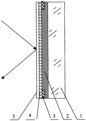 На чертеже схематически представлено в разрезе заявляемое зеркало. Оно состоит из стеклянной подложки 1, отражающего токопроводящего слоя из нержавеющей стали 2, двух электрических контактов 3, слоя из оксида кремния 4 геометрической толщиной 60-70 нм, слоя из оксида титана 5 геометрической толщиной 50-60 нм.