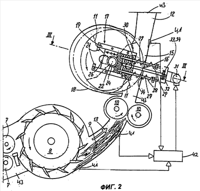 Как показано на фиг.2, на пути транспортирования измельченной убранной массы 9 установлены датчики 41. Датчики 41 находятся непосредственно за измельчительным барабаном 8, перед плющильными валками 10 и/или за вспомогательным метателем 11. Датчики 41 расположены таким образом, что отслеживают поток измельченной убранной массы 9 от ее приема до выброса. Датчики 41 вырабатывают данные в виде сигнала и подают его на известное само по себе устройство 42 обработки сигнала и вычислений, называемый далее процессор 42. Процессор 42 находится в функциональной связи с механизмом 17 смещения оси. После получения входного сигнала процессор 42 вырабатывает выходной сигнал, который передается на механизм 17 смещения оси и вызывает регулировочное смещение оси 22 вспомогательного метателя 11 в горизонтальном направлении поперечно направлению 13 потока убранной массы.