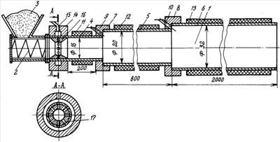 Предлагаемая печь представлена на чертеже. Печь состоит из пекарной камеры 1, соединенной со шнековой нагнетательной камерой 2 и бункером для теста 3, пекарная камера состоит из трех цилиндров 4, 5 и 6, соединенных втулками 7 и 8, которые имеют отверстия 9 и 10. Каждый цилиндр имеет нагревательный элемент 11, 12 и 13 соответственно. Цилиндр 4 соединен с нагнетательной камерой 2 с помощью втулки 14, в которой установлена форсунка для масла 15. Внутри втулки 14 установлено конусное кольцо 16, в котором выполнены радиальные отверстия 17 для подачи масла.