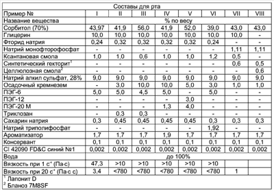 состав далее имеет вязкость по меньшей мере 10 Па·с при скорости деформации сдвига 1 с-1. В нижеследующем описании: “интегрированное устройство” или “интегрированная система ухода за полостью рта” относится к устройству или системе ухода за полостью рта, которые содержат встроенный резервуар, способный содержать состав для рта, такой как зубная паста, для доставки этого состава в полость рта; “трубка” означает закрытую внутреннюю полость, через которую от одного конца к другому могут проходить текучие вещества; “продольная ось” представляет собой ось, которая параллельна направлению потока в трубке; “внутреннее поперечное сечение” является поперечным сечением трубки, взятым в плоскости, перпендикулярной продольной оси, и окруженным внутренней поверхностью материала трубки; “длина” относится к длине трубки вдоль продольной оси; и “усилие отдачи насоса” означает усилие, развиваемое насосом или на насосе в течение заполняющей части цикла накачивания. Усилие отдачи насоса может быть определено измерением минимального усилия, требуемого для предотвращения наполнения насоса вслед за циклом выталкивания и удержания его в равновесии. Изобретение далее предлагает состав для рта, содержащий: а) от более чем 0,5% до 4% сгущающих ингредиентов, выбранных из: гекторита и его производных, гидратированных кремнеземов, третичных и четверичных производных силиката магния, бентонита, ксантановой смолы, каррагена и его производных, желлановой смолы, гидроксипропилметилцеллюлозы, склеротиновой смолы и ее производных, пуллулана, рамзановой смолы, велановой смолы, конжака, курдлана, карбомера, альгина, альгиновой кислоты, альгинатов и их производных, гидроксиэтилцеллюлозы и ее производных, гидроксипропилцеллюлозы и ее производных, производных крахмального фосфата, гуаровой смолы и ее производных, крахмала и его производных, сополимеров ангидрита малеиновой кислоты с алкенами и их производных, целлюлозной смолы и ее производных, сополимеров этиленгликоля/пропиленгликоля, полоксамеров и их производных, полиакрилатов и их производных, метилцеллюлозы и ее производных, этилцеллюлозы и ее производных, агара и его производных, гуммиарабика и его производных, пектина и его производных, хитозана и его производных, смолистых полиэтиленгликолей, таких как PEG-XM, где Х b) менее чем 20% нерастворимых твердых веществ; c) 20-70% общей воды; и d) от более чем 20% до 80% увлажнителей, выбранных из полиолей и полиэтиленгликолей; при этом состав имеет вязкость от 0,001 Па·с до 780 Па·с при скорости деформации сдвига 20 с-1 и по меньшей мере 10 Па·с при скорости деформации сдвига 1 с-1. В еще одном аспекте изобретение предлагает состав для ротовой полости, содержащий от 1% до 10% абразива; от 20% до 70% общей воды; и по меньшей мере 10% увлажнителей, выбранных из полиолей и полиэтиленгликолей; при этом композиция имеет RDA больше, чем 70 и вязкость по меньшей мере 10 Па·с при скорости деформации сдвига 1 с-1. Кроме того, предлагается набор для ухода за полостью рта, содержащий систему ухода за полостью рта и состав для рта согласно настоящему изобретению, причем система ухода за полостью рта содержит резервуар и средство для накачивания состава из резервуара к выпускному отверстию системы ухода за полостью рта. Все части, процентные доли и пропорции, которые упоминаются здесь и