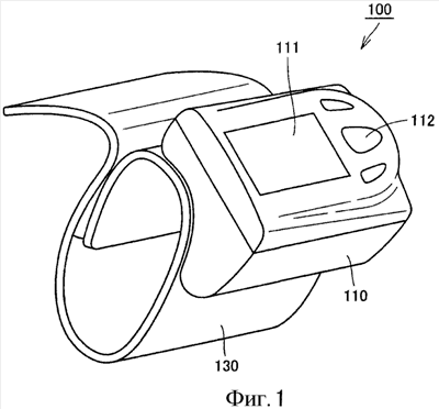 На фиг.1 показан перспективный вид измерителя артериального давления согласно первому варианту осуществления настоящего изобретения. Как видно на фиг.1, измеритель 100 артериального давления по первому варианту настоящего изобретения содержит основной корпус 110 и манжету 130. На поверхности основного корпуса 110 расположены дисплей 111 и управляющая часть 112. Манжета 130 присоединена к основному корпусу 110.