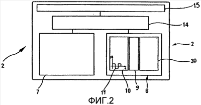 Как показано на фиг. 2, электронная схема прибора 2 в соответствии с настоящим изобретением содержит первый электронный модуль 6, предназначенный для измерения полного биоэлектрического сопротивления человека. Этот модуль содержит источник электрической энергии, в частности генератор 10 напряжения, предназначенный для выдачи электрического сигнала 11, проходящего через тело или исследуемую часть человеческого тела, когда последнее подсоединяют к электродам прибора, измерительный блок 30 и блок 9 обработки сигналов. Измерительный блок 30 принимает электрический сигнал 11 после его прохождения в человеческом теле между электродами 24, 26 измерения.