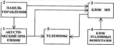 Устройство может быть выполнено из типовых модулей и на элементной базе, применяемой в медицинской радиоэлектронике. Конструктивное выполнение ряда блоков может совпадать или включать конструкции того же функционального назначения прототипа и аналогов. Например, акустический приемник 1 может совпадать по конструкции с совокупностью блоков 1-6 прототипа, блок 4 эталонных фонограмм совпадает с блоком 15 прототипа, панель 2 управления включает цифровую клавиатуру (для управления блоком 3). Конструкции остальных блоков определяются их функциональным назначением и являются типовыми, известными либо очевидными из уровня техники в применяемых временном и частотном диапазонах. Программное обеспечение блока 3 микропроцессора типовое, в частности, обеспечивающее чтение сменных магнитных карт блока 4 эталонных фонограмм.