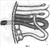 После предоперационной подготовки 26.01.04 г. выполнена диагностическая лапароскопия, во время которой в брюшной полости обнаружено большое количество серозно-геморрагического выпота, петля кишки темно-синего цвета. Проведена срединная лапаротомия. В брюшной полости серозно-геморрагический выпот до 40 мл, петли кишечника перераздуты, обнаружен заворот подвздошной кишки вокруг штранга, отходящего от дивертикула Меккеля, расположенного на расстоянии 30 см от илеоцекального угла.