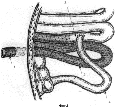 На фиг.1 представлен первый этап хирургического лечения – восстановление проходимости поврежденной кишки, включающий формирование анастомоза и энтеростомы, где 1 – энтеростома, 2 – измененный отдел кишечника, 3 – анастомоз, 4 – неизмененный отдел кишечника.