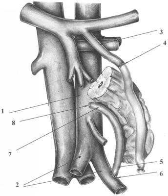 После традиционных этапов забора дистального сегмента (хвоста и тела) поджелудочной железы у трупа или живого родственного донора и его консервации, осуществления доступа в брюшную полость реципиента вскрывают париетальную брюшину от дуодено-еюнального угла до бифуркации аорты. Визуализируют брюшной отдел аорты (1), зону ее бифуркации, подвздошные артерии (2). Мобилизуют верхнюю часть брыжейки сигмовидной кишки от предпочечной фасции. Выделяют дистальную (краниальную) часть нижней брыжеечной вены (3), пересекают ее на уровне нижней горизонтальной ветви двенадцатиперстной кишки, проксимальный (каудальный) конец вены лигируют. Трансплантат укладывают забрюшинно в сформированное ложе между предпочечной фасцией и брыжейкой сигмовидной кишки задней стороной кпереди. Формируют концевой сосудистый анастомоз между проксимальным концом селезеночной вены (4) трансплантата и культей нижней брыжеечной вены, после чего формируют анастомоз (6) между дистальным концом селезеночной артерии панкреатического трансплантата (5) и левой общей подвздошной артерией по типу “конец в бок” после полного предварительного пережатия последней. Снимают зажим с нижней брыжеечной вены, затем включают артериальный кровоток, восстанавливают кровоснабжение панкреатического трансплантата. При этом по интенсивности кровотечения из проксимального конца селезеночной артерии (7) трансплантата проверяют адекватность артериального кровоснабжения сегмента поджелудочной железы, после чего проксимальную культю селезеночной артерии анастомозируют с переднебоковой стенкой инфраренального отдела брюшной аорты (8) в условиях пристеночного отжатая ее П-образным сосудистым зажимом. Формируют панкреатоэнтероанастомоз с первой петлей тощей кишки традиционной техникой. Панкреатический трансплантат укрывают сверху брыжейкой сигмовидной кишки, которую фиксируют отдельными швами по верхнему и нижнему краю поджелудочной железы к предпочечной фасции и предаортальным тканям.