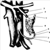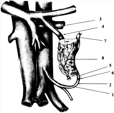 где 1 – основной ствол нижней брыжеечной артерии; 2 – левая ободочная артерия; 3 – краниальная часть нижней брыжеечной вены; 4 – анастомоз между селезеночной веной трансплантата и культей нижней брыжеечной вены; 5 – дистальный конец селезеночной артерии панкреатического трансплантата; 6 – анастомоз между дистальным концом селезеночной артерии панкреатического трансплантата и левой ободочной артерией “конец в конец”; 7 – проксимальный конец селезеночной артерии; 8 – сегмент поджелудочной железы.