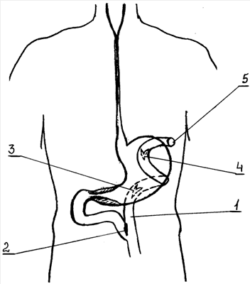 У больного с сочетанной стриктурой пищевода и антрального отдела желудка под общей анестезией выполняется верхнесрединная лапаротомия, ревизия брюшной полости. В 10 см дистальнее связки Трейца с учетом характера кровоснабжения косо пересекается тонкая кишка под углом 30 градусов к брыжейке кишки. Формируется Y-образная отключенная тонкая кишка 1 путем формирования V-образного 2 клапанного антирефлюксного энтероэнтероанастомоза по типу «конец в бок» (проксимальный конец пересеченной кишки в бок дистальному отрезку). На расстоянии 30 см от края пересечения кишки выполняется V-образный разрез на противобрыжеечном крае кишки острым углом в аборальном направлении. Длина каждого из разрезов равна диаметру косого разреза проксимального конца пересеченной кишки. На углах V-образного разреза накладываются три шва держалки через все слои кишки. Четвертая держалка накладывается серозно-мышечно по центру между концами разрезов в области противоположного угла будущего анастомоза. Формируется энтероэнтероанастомоз узловыми швами, при этом первым рядом фиксируется наружный край V-образного разреза и пересеченный проксимальный конец тонкой кишки через все слои с использованием швов держалок. И только в области четвертой держалки отключенная кишка прошивается серозно-мышечными швами, что способствует формированию свободного лоскутного клапана, выполняющего антирефлюксную функцию. В брыжейке поперечно-ободочной кишки формируется отверстие левее средней толстокишечной артерии, в которое проводится отключенная тонкая кишка. Затем формируется позадиободочный антирефлюксный клапанный гастроэнтероанастомоз с задней стенкой желудка в антральном отделе по типу «бок в бок» 3 по методике, описанной выше, при этом V-разрез производится на желудке. Лигируются и пересекаются сосуды на большой кривизне на ширину отключенной тонкой кишки. Там же проводится петля тонкой кишки, которая распластывается на желудке. В 2 см от предполагаемого переднего гастроэнтероанастомоза накладываются два поперечных шва через просвет тонкой кишки и серозно-мышечный слой желудка. Каждый из швов захватывает половину диаметра кишки. Затем эти швы прикрываются серо-серозными продольными швами на кишке. Формируется передний гастроэнтероанастомоз 4 в области дна желудка, при этом V-образный разрез выполняется на желудке. Анастомоз формируется по методике, описанной ранее. Терминальный конец отключенной по Ру кишки выводится через отдельный параректальный разрез в левом подреберье, где формируется еюностома 5 путем подшивания слизистой кишки к коже, при этом расстояние между вколами на кишке больше в три раза, чем на коже, что приводит к уменьшению диаметра стомы в три раза. Выполняют дренирование брюшной полости. Послойное ушивание раны.