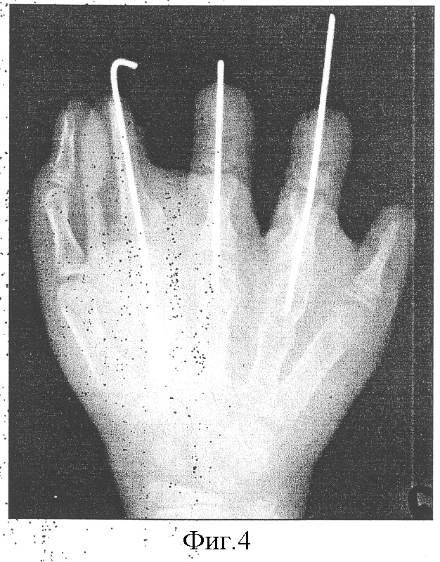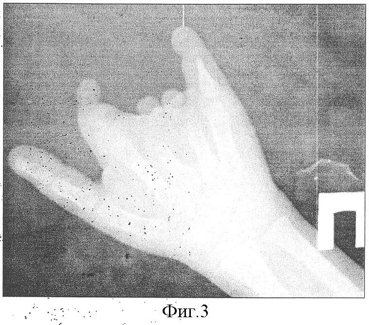 На фиг.1 представлена скиаграмма первого и второго пальцев правой кисти в прямой проекции до операции. Рудимент основной фаланги второго пальца 1. Вторая пястная кость 2. Фрагмент второй пястной, перемещаемый в позицию основной фаланги 3.