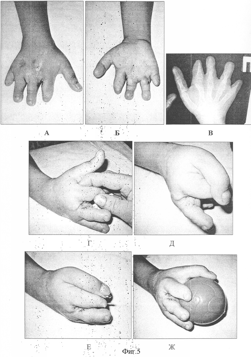 Фиг.5 – отдаленный результат через 1 год после операции: А, Б – вид кисти, В – рентгенограмма кисти. Г, Д, Е, Ж – функция кисти.