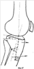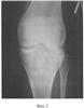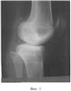 В СарНИИТО больной было проведено обследование. На рентгенограмме левой конечности в боковой проекции (фиг.1) зафиксировано переразгибание коленного сустава со смещением в сагиттальной плоскости мыщелка голени кзади на 8 мм, что свидетельствует о подвывихе и рекурвации.