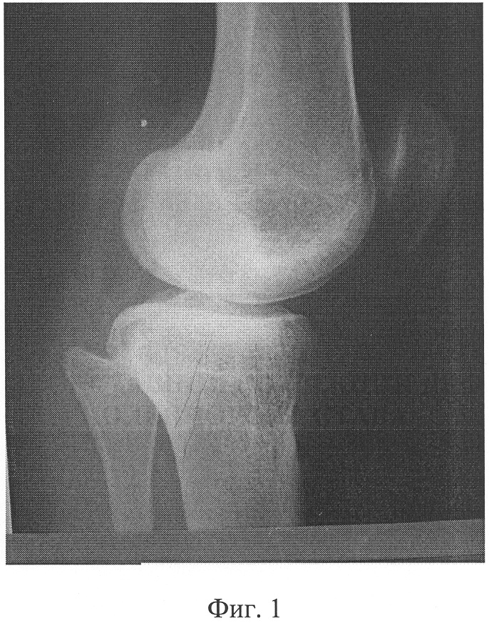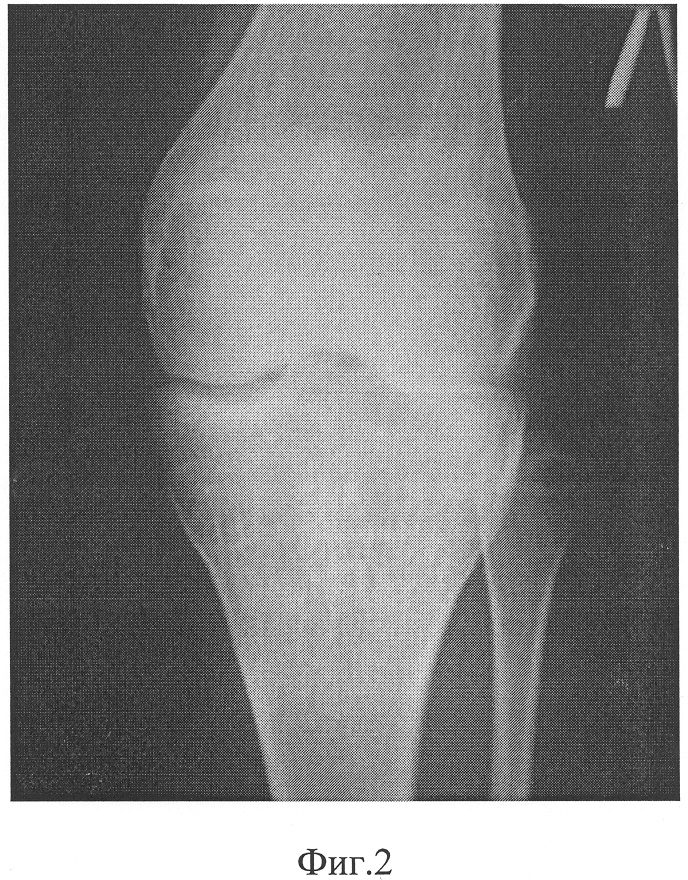На рентгенограмме левой конечности в прямой проекции (фиг.2) зафиксировано сужение и асимметрия суставной щели: полное ее отсутствие по наружнолатеральному углублению и умеренное сужение с внутреннемедиальной верхней суставной поверхности большеберцовой кости, что свидетельствует о вальгусном искривлении коленного сустава и отклонении центра голени от механической оси нижней конечности. В субхондральной зоне большеберцовой кости отмечены признаки дистрофических изменений костной структуры, что является проявлением дефицита хрящевого покрытия проксимального мыщелка большеберцовой в заднемедиальном направлении.