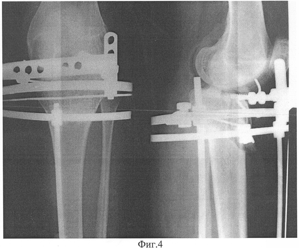 В СарНИИТО 13.12.05 было проведено оперативное вмешательство по запланированной схеме (фиг.5). Произвели дугообразный разрез по передневнутренней поверхности проксимального отдела левой голени длиной 12 см. В верхней трети левой большеберцовой кости выполнена корригирующая многоплоскостная остеотомия с формированием внесуставно костно-хрящевого суставного фрагмента. На задней поверхности голени вырезали клин углом в 10° и шириной 8 мм. Затем была пересечена в средней трети малоберцовая кость. Проведенными в сагиттальной плоскости П-образно изогнутой спицей Киршнера и стержнем костно-хрящевой фрагмент зафиксирован в аксиальной плоскости. Интраоперационно под рентгеноконтролем на голень наложен двухсекционный спице-стержневой аппарат внешней фиксации (фиг.4). Спица и стержень закреплены на верхней базовой опоре аппарата посредством тяговых устройств.