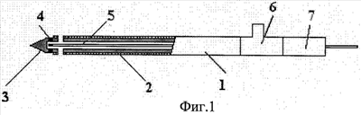 Существо предлагаемого изобретения можно понять из нижеследующего описания. На фиг.1 показано схематическое изображение активного электрода устройства для термокоагуляции биоткани в соответствии с предлагаемым способом. Электрод выполнен в виде полой металлической иглы 1, покрытой диэлектриком 2 и имеющей вблизи острия 3 отверстия, через которые в биоткань поступает теплоноситель. Направление движения теплоносителя показано на фиг.1 стрелками. Острие иглы 3 не имеет диэлектрического покрытия и изолировано от металлической иглы с помощью диэлектрической прокладки 4. В качестве острия может быть использован также любой твердый диэлектрик, например сапфир. В полости иглы 1 размещен термодатчик 5. Игла 3 подсоединена через тройник 6 к держателю электрода 7.