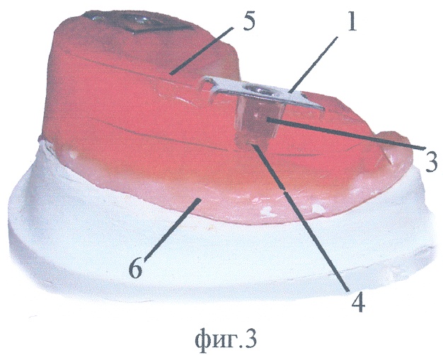 Предлагаемое устройство используется следующим образом. На жестких индивидуальных ложках верхней и нижней челюсти устанавливают восковые окклюзионные валики. Выдвигающийся стержень 4 предлагаемого устройства вкручивают полностью в ножку 3 со стороны окклюзионной площадки 1. Устройство нагревают до 50-60°С и ножкой 3 погружают в окклюзионный валик 5 до соприкосновения окклюзионной площадки 1 предлагаемого устройства с окклюзионной поверхностью воскового валика 5 (фиг.3). Если устройство не коснулось ножкой 3 индивидуальной ложки 6, то выкручивают стержень 4 до момента соприкосновения его с поверхностью индивидуальной ложки 6. Ретенционные выступы 2 окклюзионной площадки 1 при этом предотвращают вращательные движения последней. Аналогичным образом устанавливают предлагаемое устройство на верхнем и нижнем окклюзионном валиках в области шестых зубов друг напротив друга.