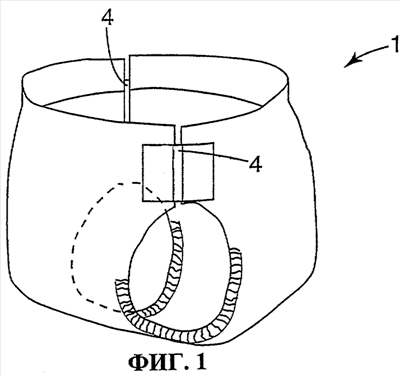 На Фиг.1 показана представленная в изобретении язычковая застежка 4, использованная с одноразовым абсорбирующим изделием 1. Эластичный язычок застежки растягивается и фиксируется на двух противоположных друг другу участках одноразового абсорбирующего изделия 1.