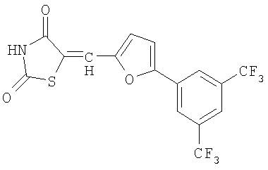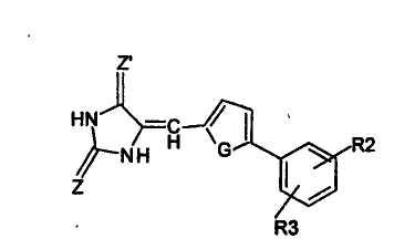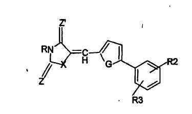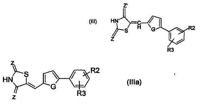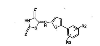 в которой Z, Z обозначают О, Х обозначает S (тиазолидиндионовая группа), G обозначает О или S; по меньшей мере один из R2 и R3 обозначает CF3, OR0 или COOR0, где R0 обозначает Н или насыщенный линейный или разветвленный С1-С20-алкил и предпочтительно С1-С10-алкил,