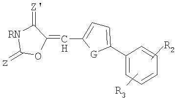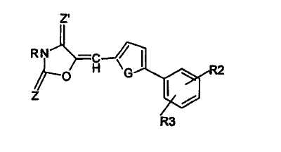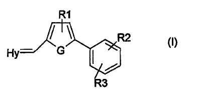 Согласно изобретению соединения формулы (I) имеют изолированную, т.е. неполимерную форму. Это фенилфураны, фенилтиофены или фенилпирролы. Кроме того, R1 может находиться в положении 3 или 4, если считать, что G находится в положении 1 пятичленного цикла. Кроме того, R2 и R3 могут находиться в любом положении содержащего их фенильного цикла и, в частности, в положении пара или мета следующей части (А):