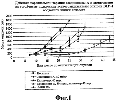 На фиг.1 представлена чувствительность устойчивых подкожных ксенотрансплантатов опухоли DLD-1 ободочной кишки человека к соединению А и камптозару, введенным каждое в отдельности и в комбинации.