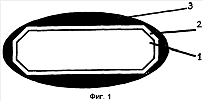 На полученные ядра 1 наносили труднорастворимую в кишечнике полимерную оболочку 2 на основе Eudragit E и поверхностно-активного вещества Твин-80, а также нерастворимую в желудке (кишечно-растворимую) оболочку 3 на основе Шеллака (Индия), пластифицированного олеиновой кислотой, в соответствии с известными технологиями (Наумчик Г.Н., Житомирский З.С., Чижиков Д.В. Применение водных растворов полимеров для создания защитных покрытий таблеток и оболочек микрокапсул. Обзорная информация. Серия Химико-фармацевтическая промышленность. ЦБНТИ медпром СССР, 1979, №4, 52 с.; Чижиков Д.В., Тепляева Б.В., Житомирский З.С. Сравнительное изучение кишечно-растворимых оболочек, полученных из некоторых полимеров, ж. Фармация, 1986, N 1 40-44; Чижиков Д.В., Андреев Б. В. Пленочные покрытия твердых лекарственных форм на основе акрилатов-Ойдрагит: Лекарственные средства. Экономика. Технология и перспективы получения: Обзорная информация. М.: ВНИИСЭНТИминмедпром 1989. – Вып.11. 49 с.).