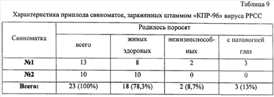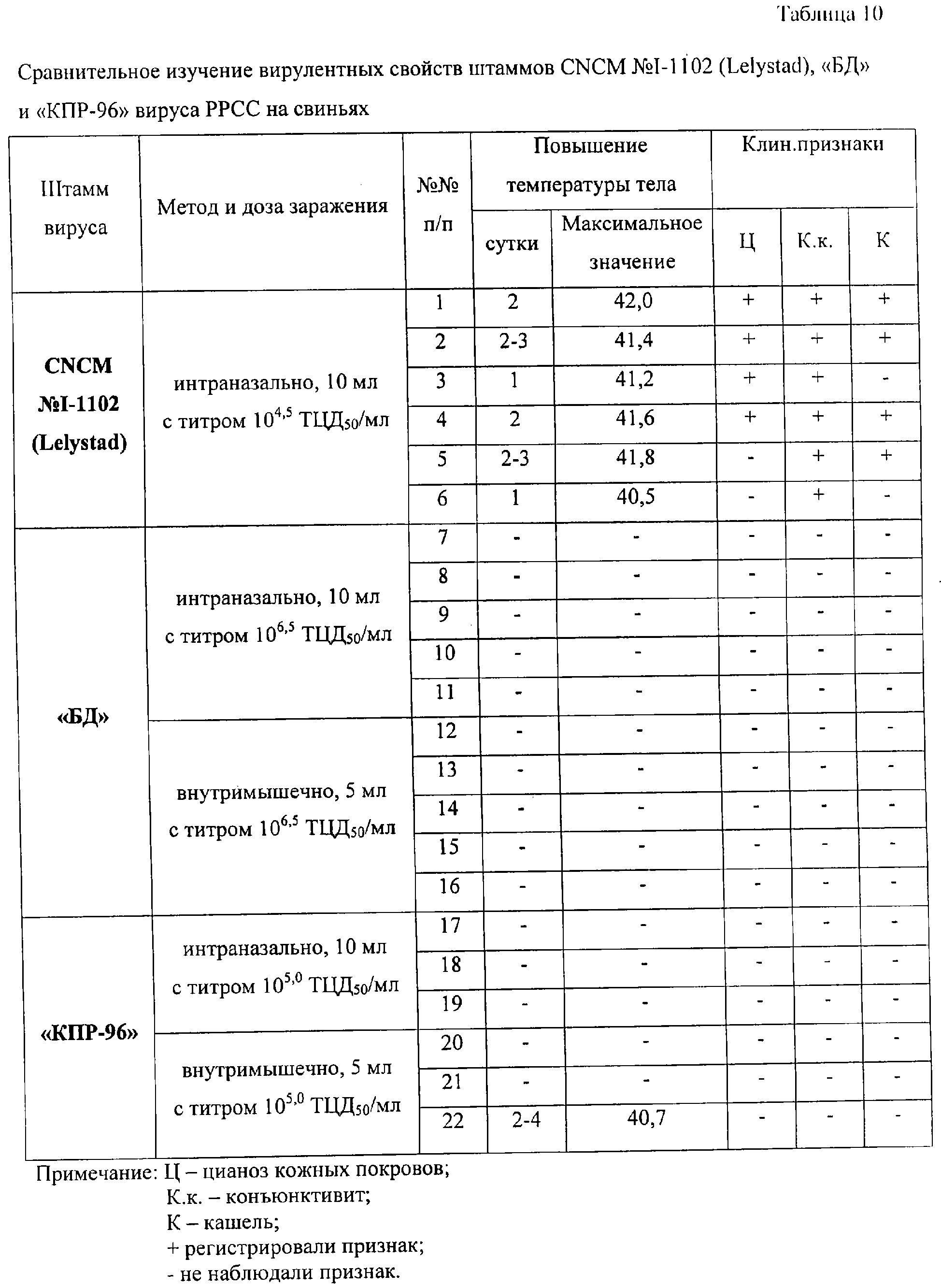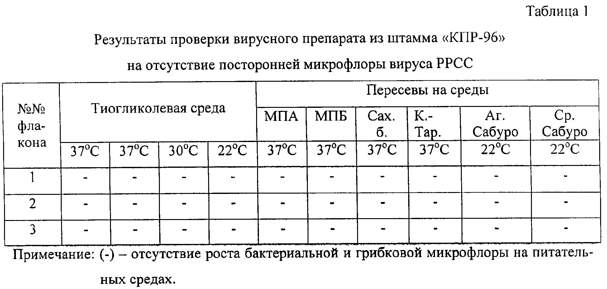 Эффективность препарата проверена на свинокомплексе №3 при вакцинации репродуктивного поголовья. Свиноматок и ремонтных свинок разделили на две группы по 60 голов в каждой. Животных опытной группы прививали испытуемой вакциной согласно временному наставлению по ее применению: первый раз двукратно с интервалом 20-30 дней за три недели до случки (осеменения), затем животных иммунизировали повторно на 60-70 день супоросности. В контрольной группе свиноматок против РРСС не прививали. После иммунизации испытуемой вакциной у привитых животных общая температура тела и в месте введения препарата оставалась в пределах физиологической нормы, каких-либо клинических признаков заболевания и отклонений не отмечали. В результате вакцинации продуктивность свиноматок в опытной группе стала выше, чем в контрольной (11 поросят на 1 свиноматку в опытной группе против 10 поросят в контрольной). В опытной группе за период подсоса пало 31, а в контрольной – 35 поросят, т.е. разница между группами составила 17,8%. Сохранность поросят-сосунов в опытной группе составила 96%, а в контрольной – 94,1%. Таким образом, приведенная выше информация свидетельствует о выполнении при использовании предлагаемого изобретения следующей совокупности условий: – вакцина против РРСС эмульсионная инактивированная, воплощающая предлагаемое изобретение, предназначена для использования в сельском хозяйстве, а именно в ветеринарной вирусологии и биотехнологии; – для предлагаемого изобретения в том виде, как оно охарактеризовано в независимом пункте формулы изобретения, подтверждена возможность его осуществления с помощью описанных в заявке или известных до даты приоритета средств и методов; – вакцина против РРСС эмульсионная инактивированная, изготовленная на основе штамма «КПР-96» в соответствии с предлагаемым изобретением, расширяет арсенал вакцин против РРСС эмульсионных инактивированных, обладающих высокой иммуногенной активностью и безвредностью и создающих напряженный и длительный иммунитет у привитых животных против циркулирующего на территории России эпизоотического вируса РРСС. Следовательно, предлагаемое изобретение соответствует условию патентоспособности «промышленная применимость». Источники информации 1. Collins J.E. et al. Isolation of swine in infertility and respiratory syndrome virus (isolate ATCC VR-2332) in North America and experimental reproduction of the disease in gnoto-biotic pigs. J. Vet. Diagn. Invest., 1992, 4, 117-126. 2. Baron T. et al. Report on the first outbreaks of the porcine reproductive syndrome (PRRS) in France. Diagnosis and viral isolation. Ann. Rech. Vet., 1992, 23(3), 335. 3. Botner A. et al. Isolation of porcine reproductive and respiratory syndrome (PRRS) virus in a Danish swine herd and experimental infection of pregnant gilts with the virus. Vet. Microbiol. (Netherlands), 1994, 40 (3-4), 351-360. 4. Brouwer J. et al. PRRS: effect on herd performance after initial infection and risk analysis. Vet. O (Netherlands), 1994, 16(2), 95-100. 5. Suarez P. et al. Direct detection of the porcine reproductive and respiratory syndrome (PRRS) virus by reverse polymerase chain reaction (RT-PCR). Arc. Virol. (Austria), 1994, 135 (1-2), 89-99. 6. Done S.H. et al. Porcine reproductive and respiratory syndrome: clinical disease pathology and immunosuppression. Vet. Rec. (England), 1995, 135 (1-2), 89-99. 7. Семенихин А.А. и др. Новая патология свиней с репродуктивным и респираторным синдромом (эпизоотический поздний аборт свиней). Вопр. вет. вирусол., микробиол. и эпизоотологии. – Покров, 1992, ч.2, 243-244. 9. Wensvoort G. et al. Mystery Swine Disease in the Netherlands: The isolation of Letystad virus. Vet. Quarterly, 1991, 13, 3, 121-130. 10. Wensvoort G. et al. Antigenic comparison of Lelystad virus and swine infertility and respiratory syndrome virus. J.Vet.diagn.invest., 1992, v.4, p.134-138. 11. Nelson E.A. et al. Differentiation of US and European Isolates of Porcine Reproductive and Respiratory Syndrome Virus by Monoclonal Ant