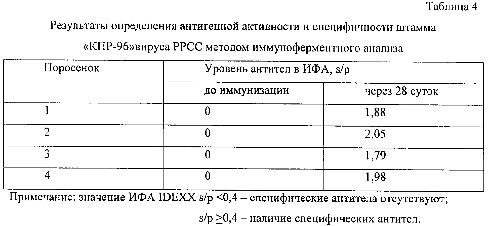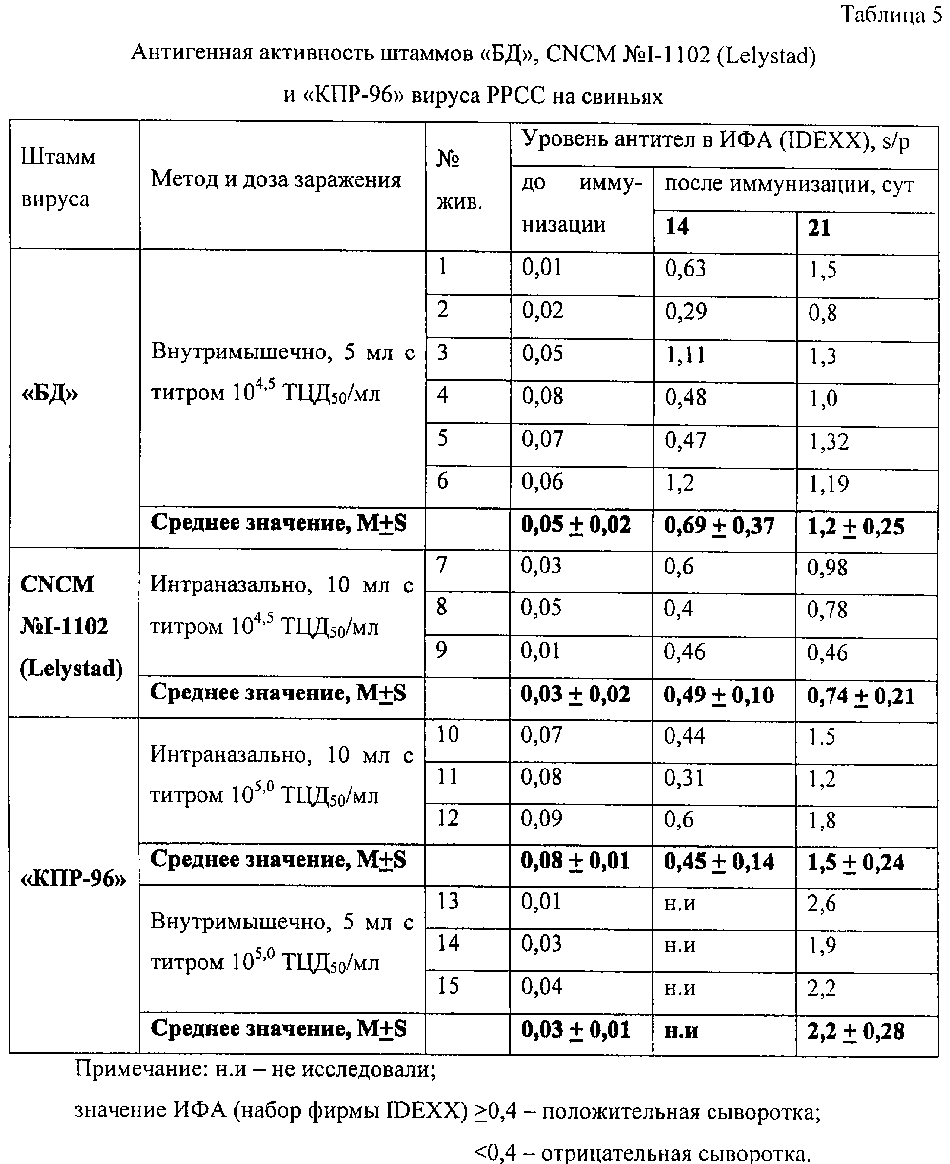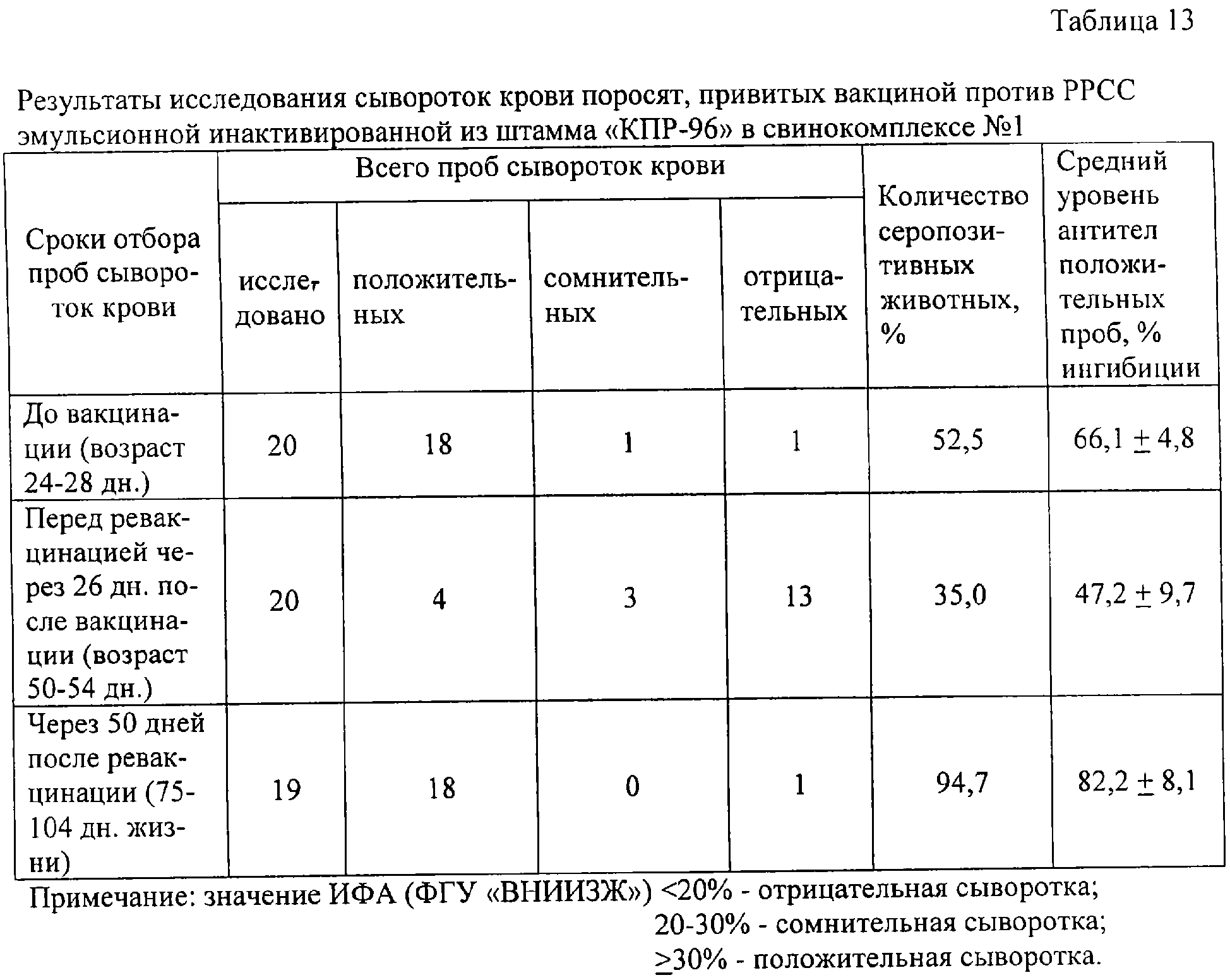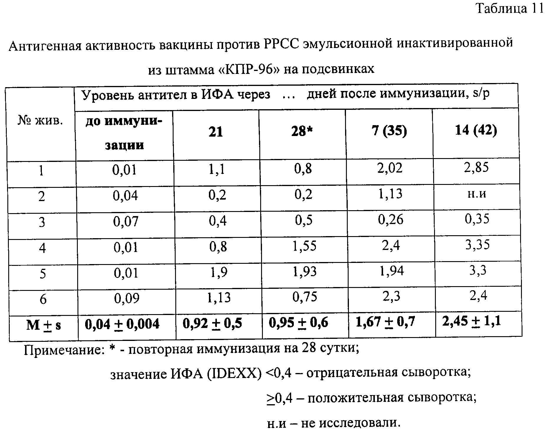 Содержание антигена в вакцине в указанном выше значении является его эффективным количеством в препарате, обеспечивающим достижение технического результата. Полученную вакцину фасуют в стеклянные флаконы и контролируют в соответствии с техническими условиями на стерильность, безвредность и антигенную активность. Вакцину проверяли на стерильность посевом на следующие питательные среды: МПБ, МПА, МППБ, среду Сабуро и тиогликолевую среду. Во всех случаях роста микрофлоры отмечено не было. Безвредность вакцины проверяли на шести белых мышах и двух подсвинках, которым подкожно и внутримышечно вводили по 0,5 мл и 5,0 мл вакцины соответственно. За животными вели наблюдение в течение 10 и 15 суток соответственно, затем их усыпили и провели патологоанатомическое вскрытие. За период наблюдения (10 дней у мышей и 15 дней у подсвинков) все животные оставались здоровыми. На месте введения вакцины наблюдали незначительную припухлость и на вскрытии при осмотре места введения отмечали единичные, мелкие инкапсулированные очажки диаметром 1-3 мм у мышей и 5-7 мм у подсвинков, при разрезе которых выделялось вакцинное содержимое. Определение антигенной активности вакцины проводили на шести серонегативных по отношению к РРСС поросятах 2,5-3-месячного возраста живой массой 25-30 кг. Вакцину вводили в дозе 2 мл внутримышечно в среднюю треть шеи (за ухом) двукратно с интервалом 28 суток. За животными вели клиническое наблюдение в течение 45 суток и периодически отбирали пробы крови. Сыворотки крови исследовали в ИФА с использованием коммерческого набора фирмы IDEXX (США) на наличие специфических антител к вирусу РРСС. Результаты исследования сывороток крови поросят до и в различные сроки после вакцинации представлены в таблице 11. Согласно данным таблицы 11 специфические антитела к вирусу РРСС на уровне s/p Через 28 дней после вакцинации средний уровень антител в группе значительно повысился и составил s/p 0,95±0,24, однако одно животное осталось серонегативным. Через неделю после ревакцинации наблюдали существенный прирост антител к вирусу РРСС, в том числе и у ранее серонегативного подсвинка, а показатель s/p у него вырос с 0,2 до 1,13. Через 14 дней после ревакцинации средний уровень антител в группе составил s/p 2,45±0,49. У одного из поросят после ревакцинации произошло снижение уровня антител с 0,5 до 0,35, что возможно связано с особенностями работы иммунной системы у данного животного. Результаты клинического наблюдения за привитыми подсвинками показали, что после иммунизации у всех животных повышение температуры тела и в месте введения вакцины не регистрировали. Общее состояние животных оставалось в пределах физиологической нормы. Таким образом, полученная вакцина инактивированная эмульсионная из штамма «КПР-96» является стерильным, безвредным препаратом и обладает достаточной антигенной активностью. Вакцину применяют для профилактической иммунизации свиней в угрожаемых и неблагополучных по РРСС хозяйств. В угрожаемых по РРСС хозяйствах свиноматок и ремонтных свинок прививают двукратно с интервалом 20-30 дней за три недели до случки (осеменения). В последующем ранее иммунизированных свиноматок прививают однократно за три-четыре недели до случки (осеменения). В неблагополучных по РРСС хозяйствах свиноматок и ремонтных свинок прививают первый раз двукратно