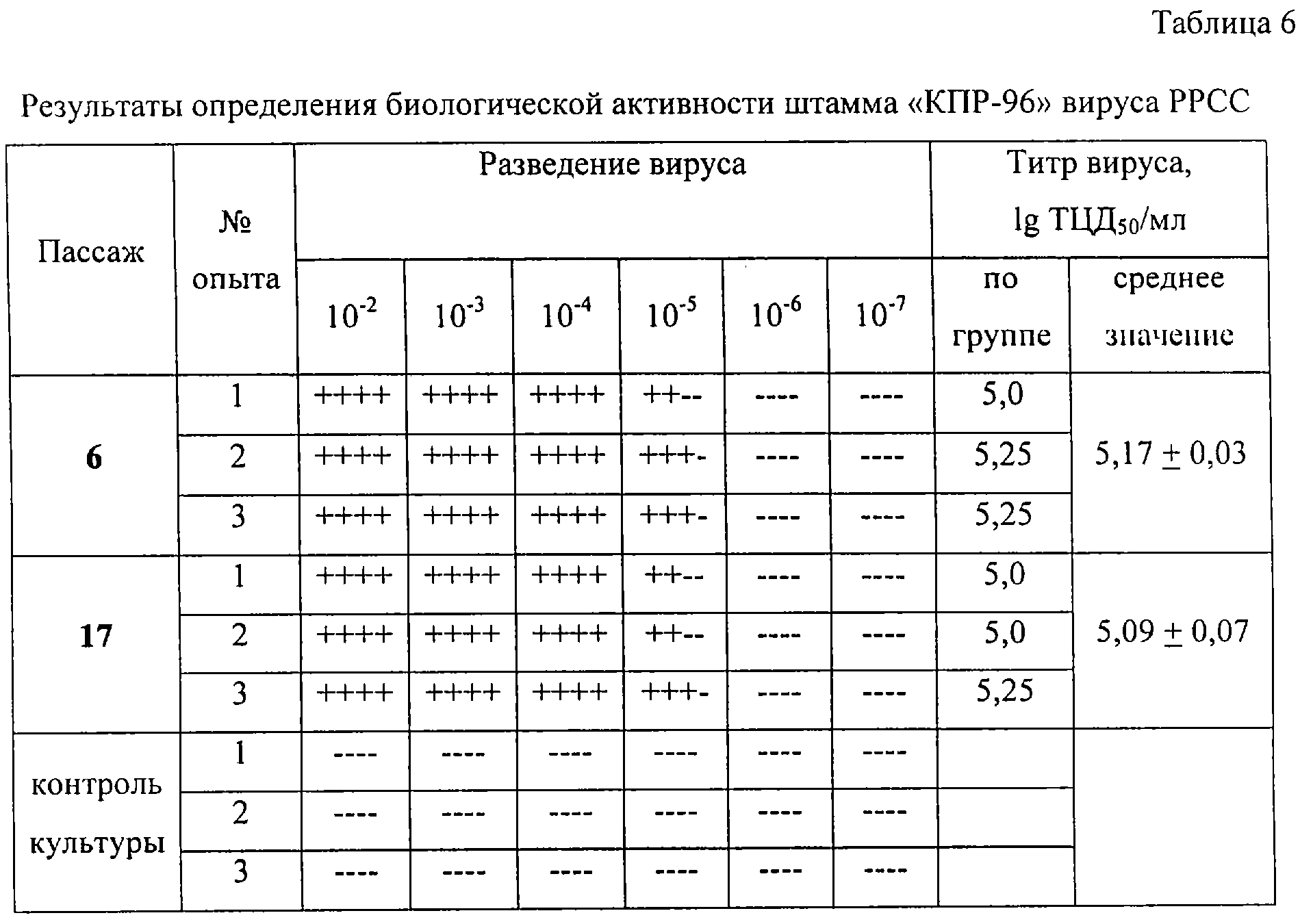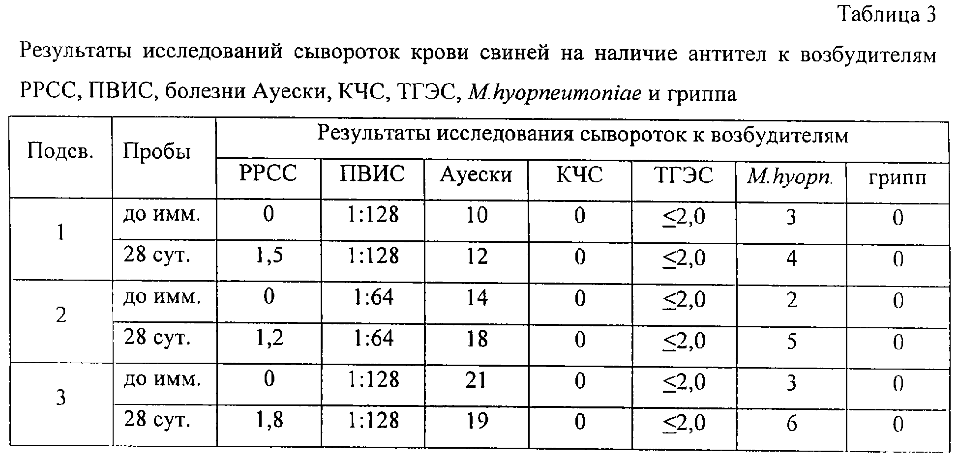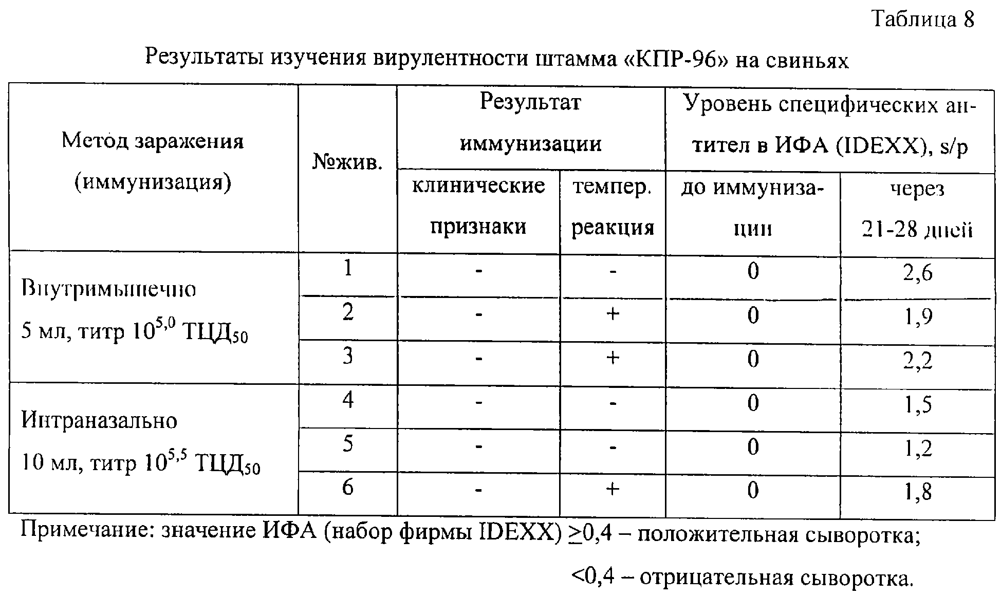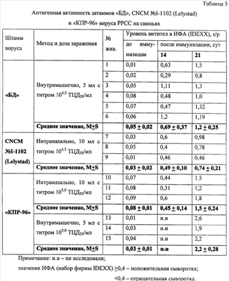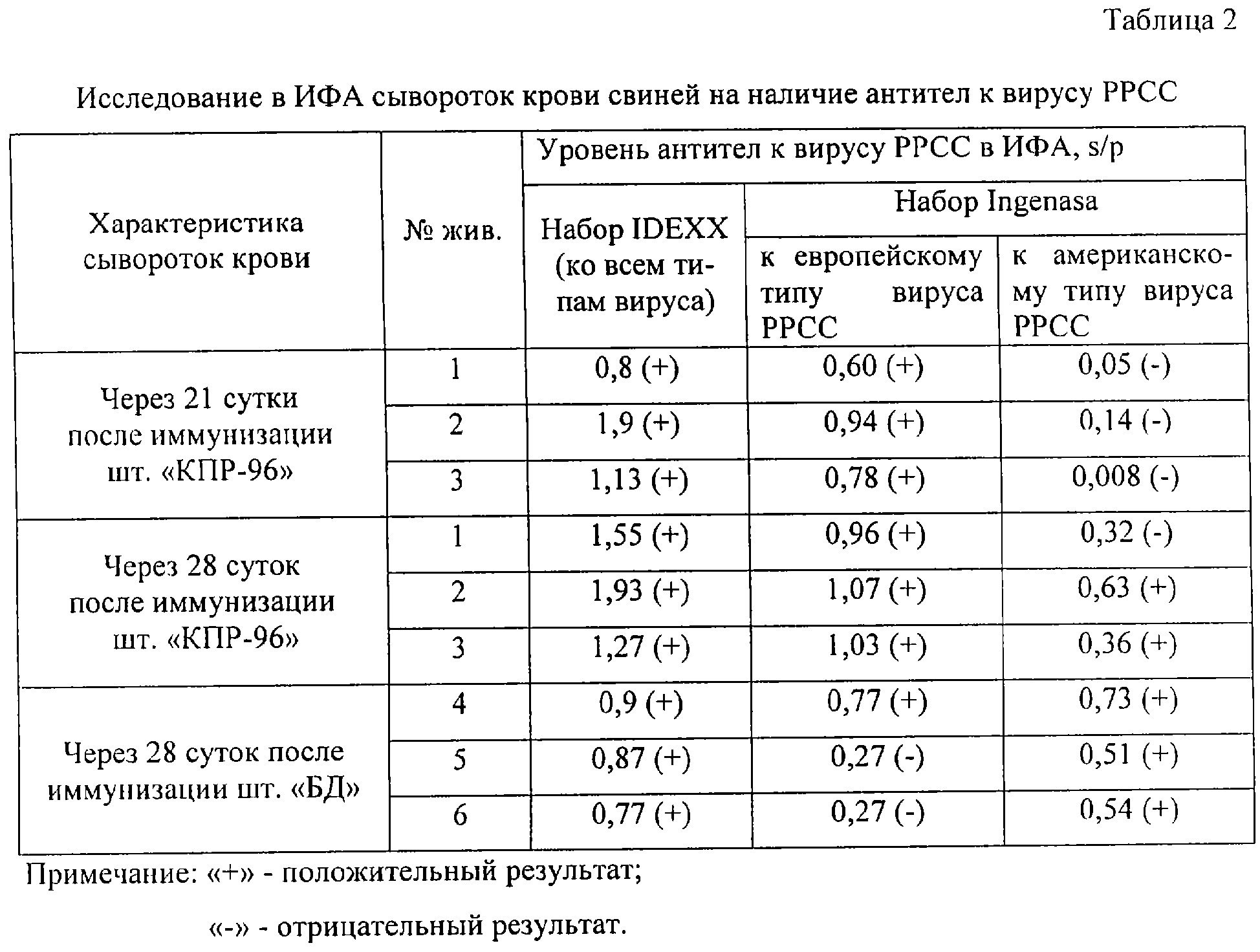 Содержание антигена в вакцине в указанном выше значении является его эффективным количеством в препарате, обеспечивающим достижение технического результата. Полученную вакцину фасуют в стеклянные флаконы и контролируют в соответствии с техническими условиями на стерильность, безвредность и антигенную активность. Вакцину проверяли на стерильность посевом на следующие питательные среды: МПБ, МПА, МППБ, среду Сабуро и тиогликолевую среду. Во всех случаях роста микрофлоры отмечено не было. Безвредность вакцины проверяли на шести белых мышах и двух подсвинках, которым подкожно и внутримышечно вводили по 0,5 мл и 5,0 мл вакцины соответственно. За животными вели наблюдение в течение 10 и 15 суток соответственно, затем их усыпили и провели патологоанатомическое вскрытие. За период наблюдения (10 дней у мышей и 15 дней у подсвинков) все животные оставались здоровыми. На месте введения вакцины наблюдали незначительную припухлость и на вскрытии при осмотре места введения отмечали единичные, мелкие инкапсулированные очажки диаметром 1-3 мм у мышей и 5-7 мм у подсвинков, при разрезе которых выделялось вакцинное содержимое. Определение антигенной активности вакцины проводили на шести серонегативных по отношению к РРСС поросятах 2,5-3-месячного возраста живой массой 25-30 кг. Вакцину вводили в дозе 2 мл внутримышечно в среднюю треть шеи (за ухом) двукратно с интервалом 28 суток. За животными вели клиническое наблюдение в течение 45 суток и периодически отбирали пробы крови. Сыворотки крови исследовали в ИФА с использованием коммерческого набора фирмы IDEXX (США) на наличие специфических антител к вирусу РРСС. Результаты исследования сывороток крови поросят до и в различные сроки после вакцинации представлены в таблице 11. Согласно данным таблицы 11 специфические антитела к вирусу РРСС на уровне s/p Через 28 дней после вакцинации средний уровень антител в группе значительно повысился и составил s/p 0,95±0,24, однако одно животное осталось серонегативным. Через неделю после ревакцинации наблюдали существенный прирост антител к вирусу РРСС, в том числе и у ранее серонегативного подсвинка, а показатель s/p у него вырос с 0,2 до 1,13. Через 14 дней после ревакцинации средний уровень антител в группе составил s/p 2,45±0,49. У одного из поросят после ревакцинации произошло снижение уровня антител с 0,5 до 0,35, что возможно связано с особенностями работы иммунной системы у данного животного. Результаты клинического наблюдения за привитыми подсвинками показали, что после иммунизации у всех животных повышение температуры тела и в месте введения вакцины не регистрировали. Общее состояние животных оставалось в пределах физиологической нормы. Таким образом, полученная вакцина инактивированная эмульсионная из штамма «КПР-96» является стерильным, безвредным препаратом и обладает достаточной антигенной активностью. Вакцину применяют для профилактической иммунизации свиней в угрожаемых и неблагополучных по РРСС хозяйств. В угрожаемых по РРСС хозяйствах свиноматок и ремонтных свинок прививают двукратно с интервалом 20-30 дней за три недели до случки (осеменения). В последующем ранее иммунизированных свиноматок прививают однократно за три-четыре недели до случки (осеменения). В неблагополучных по РРСС хозяйствах свиноматок и ремонтных свинок прививают первый раз двукратно
