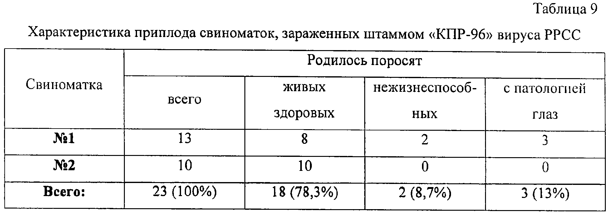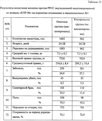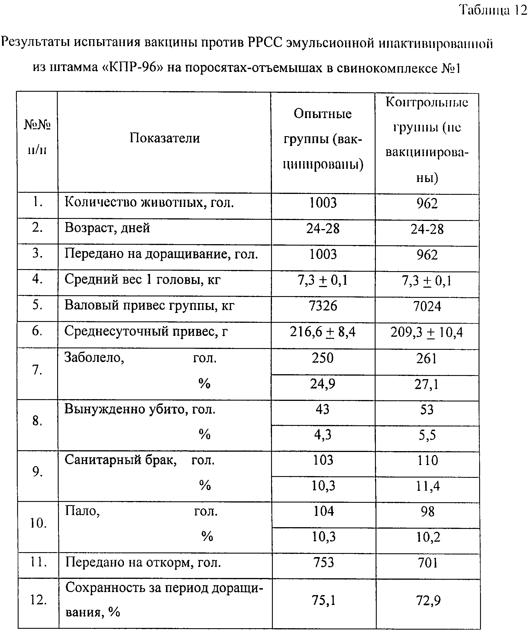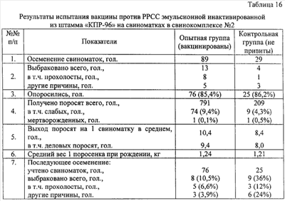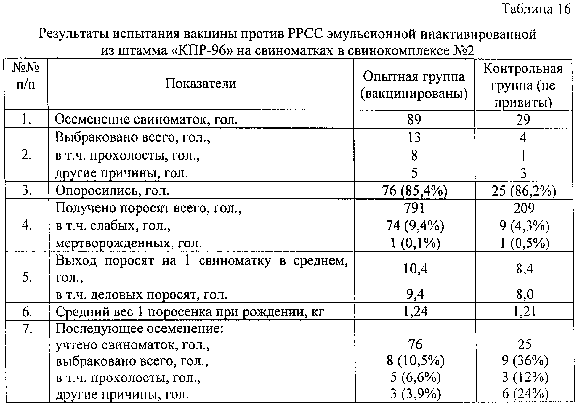 Эффективность препарата проверена на свинокомплексе №2 при вакцинации репродуктивного поголовья. Свиноматок и ремонтных свинок разделили на две группы по 60 голов в каждой. Животных опытной группы прививали испытуемой вакциной согласно временному наставлению по ее применению: первый раз двукратно с интервалом 20-30 дней за три недели до случки (осеменения), затем животных иммунизировали повторно на 60-70 день супоросности. В контрольной группе свиноматок против РРСС не прививали. После иммунизации испытуемой вакциной у привитых животных общая температура тела и в месте введения препарата оставалась в пределах физиологической нормы, каких-либо клинических признаков заболевания и отклонений не отмечали. Результаты испытания «КПР-96» на свиноматках в свинокомплексе №2 представлены в таблице 16. Из представленных в таблице 16 данных следует, что в опытной группе выход поросят на 1 свиноматку выше, чем в контрольной (10,4 поросенка против 8,4). У привитых свиноматок средний вес новорожденного поросенка был также выше по сравнению с контрольной группой (1,24 против 1,21 кг). При последующем осеменении (в первую охоту после перевода поросят на доращивание) среди ранее привитых эмульсионной инактивированной вакциной из штамма «КПР-96» свиноматок уровень прохолостов был ниже, чем в контрольной группе (6,6% против 12% у контрольных животных). Пример 7. Проведены испытания эффективности вакцины против РРСС эмульсионной инактивированной, изготовленной так, как описано в примере 3, и содержащей, мас.%: