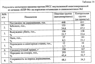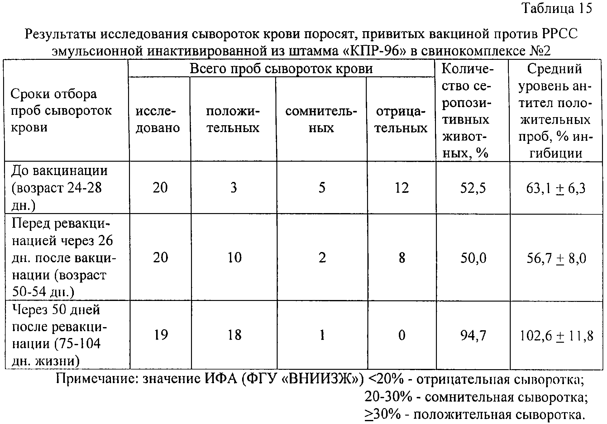 Эффективность препарата проверена на свинокомплексе №2. В этом хозяйстве заболевание проявлялось в основном в респираторной форме на поросятах группы доращивания в 45-55-дневном возрасте. Общий уровень гибели и вынужденного убоя составлял в среднем 40-50%. Для проведения исследований были сформированы опытная и контрольная группы (сектора) из поросят 25-28-дневного возраста. Животных прививали в возрасте 25-28 дней жизни с ревакцинацией спустя 3-4-недели. В 35-дневном возрасте эти поросята были переведены в группу доращивания, слабые и отстающие в росте животные – выбракованы. Результаты испытания вакцины из штамма «КПР-96» на поросятах-отъемышах в свинокомплексе №2 представлены в таблице 14. Из представленных в таблице 14 данных следует, что в опытной группе заболеваемость и смертность были ниже, чем у непривитых животных. Среднесуточный привес был также выше в группе вакцинированных животных (190 г против 167 г в контрольной). Сохранность за период доращивания была также выше у привитых животных (68,1% против 54,3% в контрольной). Результаты исследований сывороток крови поросят в ИФА (ФГУ «ВНИИЗЖ»), полученные в ходе испытания вакцины из штамма «КПР-96» в свинокомплексе №2, представлены в таблице 15. Данные таблицы 15 свидетельствуют о том, что до вакцинации процент серонегативных в отношении РРСС животных составил 52,5%. Это объясняется тем, что в это время (24-28 дней жизни) в сыворотках крови животных выявляли колостральные антитела довольно высокого уровня в связи с тем, что поросята получены от переболевших и вакцинированных против РРСС и ПВИС свиноматок. Спустя 26 дней после вакцинации количество серопозитивных животных уменьшилось до 35%, что связано с уменьшением уровня колостральных и недостаточным образованием поствакцинальных антител. После ревакцинации процент иммунных животных возрос до 94,7%. Одновременно повысился средний уровень антител с 56,7±8,0 перед вакцинацией до 102,6±11,8 спустя 50 дней после вакцинации. Пример 6. Проведены испытания эффективности вакцины против РРСС эмульсионной инактивированной, изготовленной так, как описано в примере 3, и содержащей, мас.%: