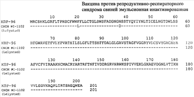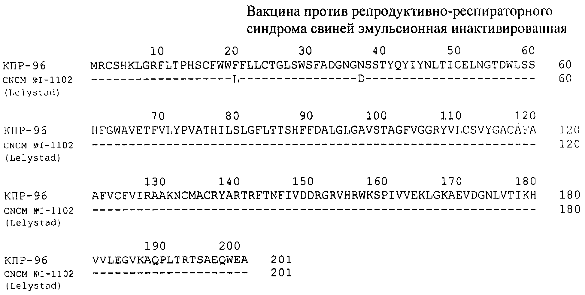 Предлагаемое изобретение расширяет арсенал вакцин против РРСС эмульсионных инактивированных, обладающих высокой антигенной и иммуногенной активностью и безвредностью и создающих напряженный и длительный иммунитет у привитых животных против циркулирующего на территории России эпизоотического вируса РРСС. Достижение технического результата от использования предлагаемого изобретения объясняется тем, что оно содержит суспензию авирулентного и очищенного антигенного материала из штамма «КПР-96» вируса РРСС, сохраняющего нативные иммунобиологические свойства после инактивации и обладающего высокой антигенной и иммуногенной активностью и безвредностью. Экспериментально подтверждена возможность его использования для изготовления вакцины против РРСС эмульсионной инактивированной. Штамм «КПР-96» вируса РРСС обеспечивает получение эффективной инактивированной вакцины против РРСС, создающей защиту восприимчивых животных от возбудителя заболевания, циркулирующего на территории России. Сущность изобретения пояснена на графическом изображении, на котором представлены результаты сравнения последовательностей аминокислот белка GP5 штамма «КНР-96» и штамма CNCM №I-1102 (Lelystad) вируса РРСС, а также в перечне последовательностей, в котором: SEQ ID NO:1 представляет последовательность нуклеотидов гена OPC5 штамма «КПР-96» вируса РРСС; SEQ ID NO:2 – последовательность аминокислот белка GP5 штамма «КПР-96» вируса РРСС. Штамм «КПР-96» вируса РРСС характеризуется следующими признаками и свойствами. Морфологические свойства Штамм «КПР-96» вируса РРСС относится к семейству Arferiviridae, роду Arterivirus, RNA-геномный, обладает морфологическими признаками, характерными для вируса РРСС: форма вириона шарообразная. Размер вириона 45-75 им с ядром, занимающим 3/4 вириона диаметром 25-35 нм, окружен липидной оболочкой. Антигенные свойства Вирус РРСС штамма «КПР-96» стабильно нейтрализуется гомологичной антисывороткой. Вирус не обладает гемагглютинирующими свойствами. При вакцинации антиген из штамма «КПР-96» индуцирует образование специфических антител, выявляемых в иммуноферментном анализе (ИФА). Определение антигенной активности и специфичности штамма «КПР-96» вируса РРСС проводили путем выявления специфических антител в сыворотках крови свиней, полученных через 28 суток после их иммунизации эмульсионной инактивированной вакциной, изготовленной из штамма «КПР-96» вируса РРСС. До иммунизации в сыворотках крови животных антител к вирусу РРСС не выявляли, а через 28 суток после вакцинации во всех пробах выявляли в ИФА специфические антитела в пределах от 1,79 до 2,05. Биотехнологические характеристики Штамм «КПР-96» проявляет высокую биологическую активность. Биологическую активность штамма определяли путем титрования на культуре клеток Marc-145. Вирус 6 и 17 пассажей, полученный в культуре клеток Marc-145, использовали для типирования после двукратного замораживания-оттаивания и низкоскоростного центрифугирования для осаждения клеточного детрита. Результаты типирования на культуре клеток Marc-145 показали, что биологическая активность штамма «КПР-96» вируса РРСС 6 пассажа в среднем составила 5,17 lg ТЦД50/мл, а 17 пассажа – 5,09 lg ТЦД50/мл. Разница в титрах вируса 6 и 17 пассажей несущественна, т.е. в результате 11 пассажей биологическая активность штамма «КПР-96» вируса РРСС оставал