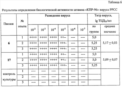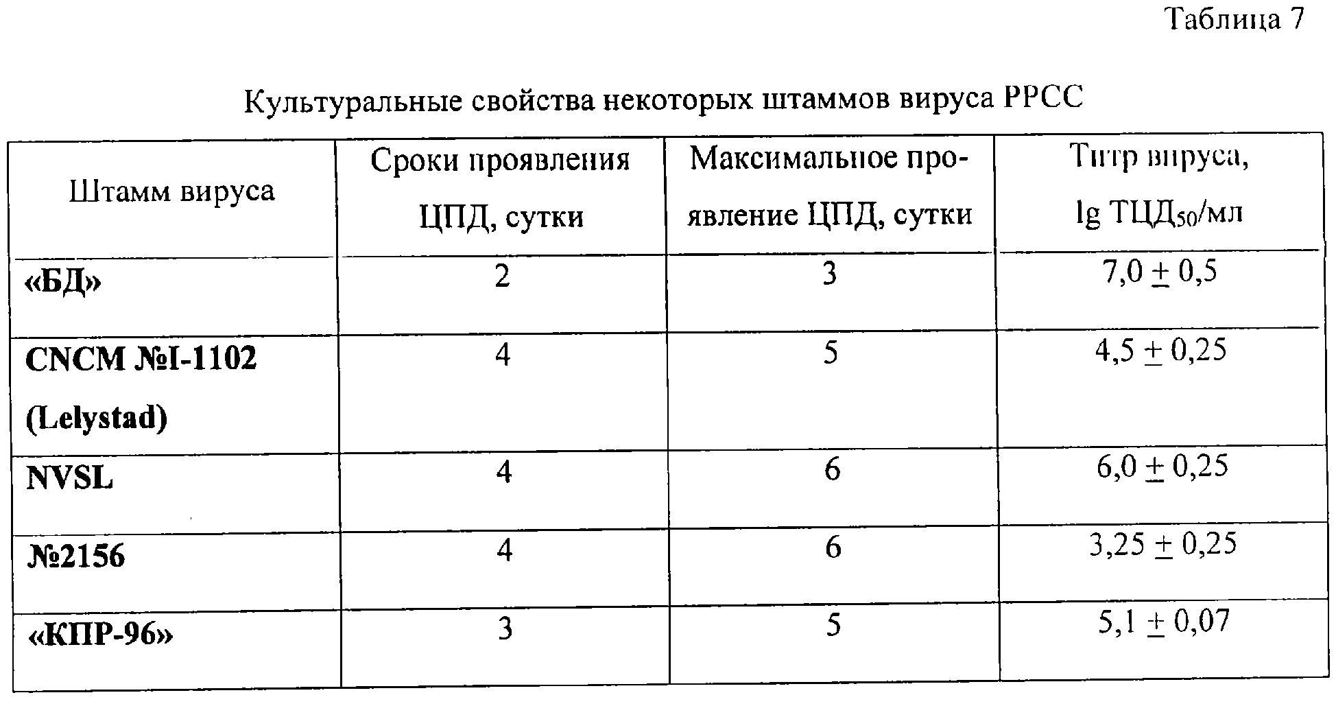 Общим недостатком известных вакцин против РРСС является их низкая противоэпизоотическая эффективность для Российской Федерации, обусловленная тем, что штаммы РРСС, используемые для их изготовления, обладают антигенными и иммунобиологическими отличиями по сравнению с аналогичными характеристиками эпизоотических изолятов вируса РРСС, выделенных на территории России в различные временные промежутки. Наиболее близкой предлагаемому изобретению по совокупности существенных признаков является вакцина против РРСС эмульсионная инактивированная, содержащая активное вещество в виде суспензии авирулентного и очищенного антигенного материала из штамма CNCM №I-1102 (Lelystad) вируса РРСС, полученного в чувствительной биологической системе, и целевую добавку в виде масляного адъюванта в эффективном соотношении (15). Недостаток вакцины-прототипа состоит также в ее низкой противоэпизоотической эффективности для Российской Федерации, обусловленной тем, что используемый для ее изготовления штамм CNCM №I-1102 (Lelystad) обладает антигенными и иммунобиологическими отличиями по сравнению с аналогичными характеристиками эпизоотических изолятов вируса РРСС, выделенных на территории России в различные временные промежутки. Кроме того, штамм CNCM №I-1102 (Lelystad) является вирулентным, что всегда создает проблемы при выполнении требований ветеринарно-санитарной безопасности. В связи с этим актуальной остается проблема создания новых вакцинных препаратов против РРСС эмульсионных инактивированных на основе новых штаммов вируса РРСС, обладающих высокой антигенной и иммуногенной активностью. В задачу создания настоящего изобретения входила разработка вакцины против РРСС эмульсионной инактивированной, создающей напряженный и длительный иммунитет у привитых животных против циркулирующего на территории России эпизоотического вируса РРСС. Технический результат от использования предлагаемого изобретения заключается в расширении арсенала вакцин против РРСС эмульсионных инактивированных, обладающих высокой антигенной и иммуногенной активностью и безвредностью и создающих напряженный и длительный иммунитет у привитых животных против циркулирующего на территории России эпизоотического вируса РРСС. Указанный технический результат достигнут созданием вакцины против РРСС эмульсионной инактивированной, охарактеризованной следующей совокупностью признаков. Предложенное изобретение содержит активное вещество в виде суспензии авирулентного и очищенного антигенного материала из штамма «КПР-96» (авторское наименование) вируса РРСС, полученного в культуре клеток млекопитающих, и целевую добавку в виде масляного адъюванта в эффективном соотношении. Исходный вирус для получения штамма «КПР-96» выделен в 1996 году из сыворотки крови абортировавших свиноматок с клиническими признаками РРСС из СХП «Победа» Ленинск-Кузнецкого района Кемеровской области и адаптирован серийными пассажами к культуре клеток почки африканской зеленой мартышки Marc-145. Инфекционная активность штамма «КПР-96» вируса РРСС 6 пассажа в среднем составила 5,17 lg ТЦД50/мл, а 17 пассажа – 5,09 lg ТЦД50/мл. В нативном виде штамм «КПР-96» является слабовирулентным для свиней. Штамм «КПР-96» депонирован во Всероссийской государственной коллекции штаммов микроорганизмов, используемых в ве