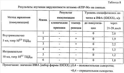 1. Вакцина против репродуктивно-респираторного синдрома свиней (РРСС) эмульсионная инактивированная, содержащая активное вещество и целевую добавку, отличающаяся тем, что в качестве активного вещества она содержит суспензию авирулентного и очищенного антигенного материала из штамма «КПР-96» вируса РРСС, семейства Arteriviridae, рода Arterivirus, коллекция ФГУ «ВГНКИ» «КПР-96» – ДЕП, в эффективном количестве. 2. Вакцина по п.1, отличающаяся тем, что она содержит суспензию авирулентного и очищенного антигенного материала из штамма «КПР-96» вируса РРСС, полученного в чувствительной биологической системе. 3. Вакцина по п.2, отличающаяся тем, что она содержит суспензию авирулентного и очищенного антигенного материала из штамма «КПР-96» вируса РРСС, полученного в культуре клеток Marc-145 с инфекционной активностью не менее 5,0 lg ТЦД50/мл. 4. Вакцина по п.3, отличающаяся тем, что она содержит суспензию авирулентного и очищенного антигенного материала из штамма «КПР-96» вируса РРСС, полученного в культуре клеток Marc-145 с инфекционной активностью не менее 5,0 lg ТЦД50/мл, в количестве 33,0 мас.%. 5. Вакцина по п.1, отличающаяся тем, что в качестве целевой добавки она содержит масляный адъювант. 6. Вакцина по п.5, отличающаяся тем, что из масляных адъювантов она содержит масляный адъювант марки Montanide ISA-70. 7. Вакцина по п.6, отличающаяся тем, что она содержит масляный адъювант марки Montanide ISA-70 в количестве 67,0 мас.%. 8. Вакцина по любому из пп.1-7, отличающаяся тем, что она содержит суспензию авирулентного и очищенного антигенного материала из штамма «КПР-96» вируса РРСС, полученного в культуре клеток Marc-145 с инфекционной активностью не менее 5,0 lg ТЦД50/мл, и масляный адъювант марки Montanide ISA-70 в соотношении, мас.%: