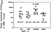 На фигуре 4 представлены ИФА титры антител к E1E2809 мышей, иммунизированных E1E2809 плюс CpG; Е1Е2809 плюс MF59; E1E2809 плюс CpG и MF59; и E1E2809 плюс 4XMF59, как описано в примерах. Кружками обозначены титры антител в индивидуальных мышиных сыворотках. Прямоугольники представляют собой среднее геометрическое титра антител (GMT) в группе из 10 мышей. Линии, отражающие величины ошибки, представляют собой интервалы сравнения для статистически значимых различий, определяемых по односторонней оценке дисперсии.