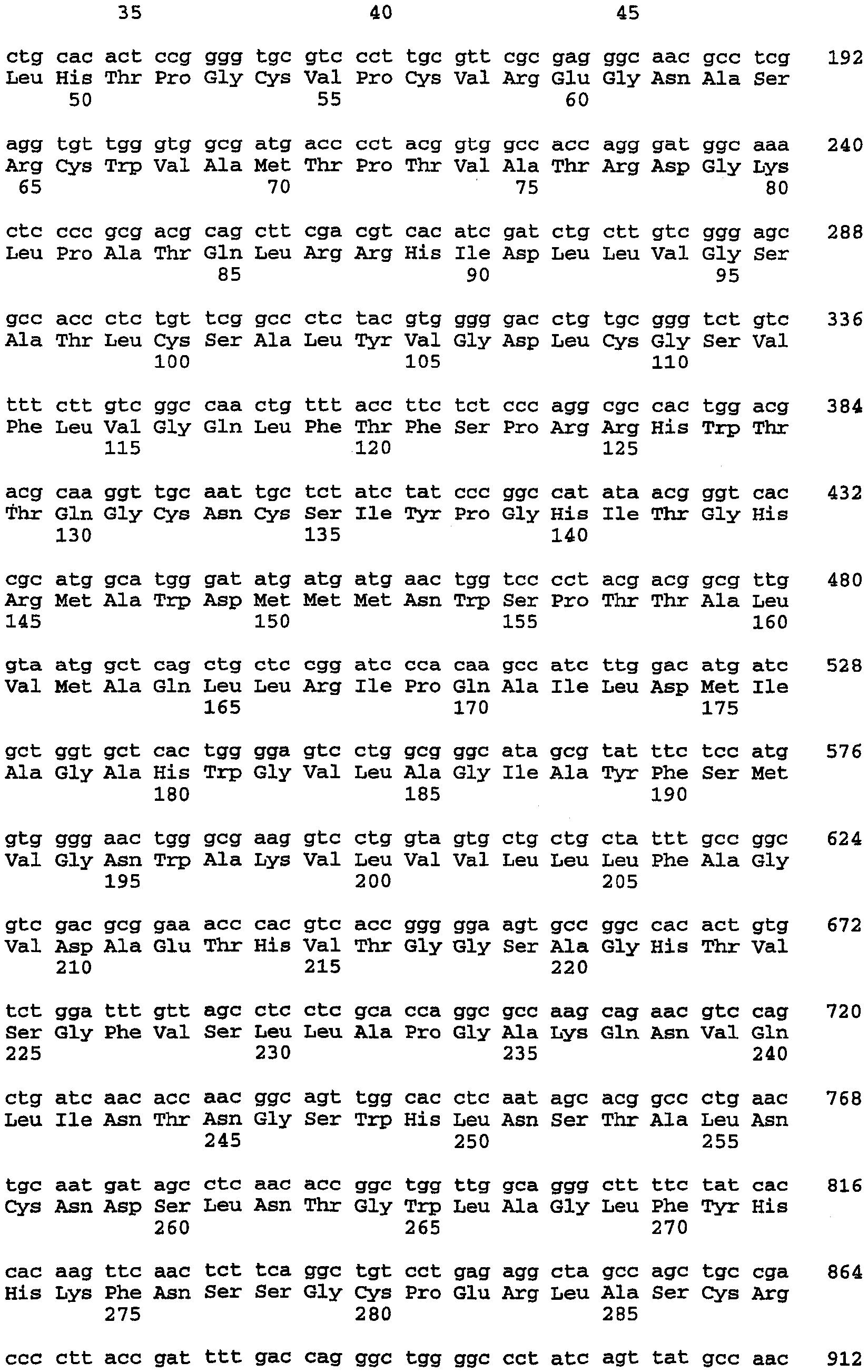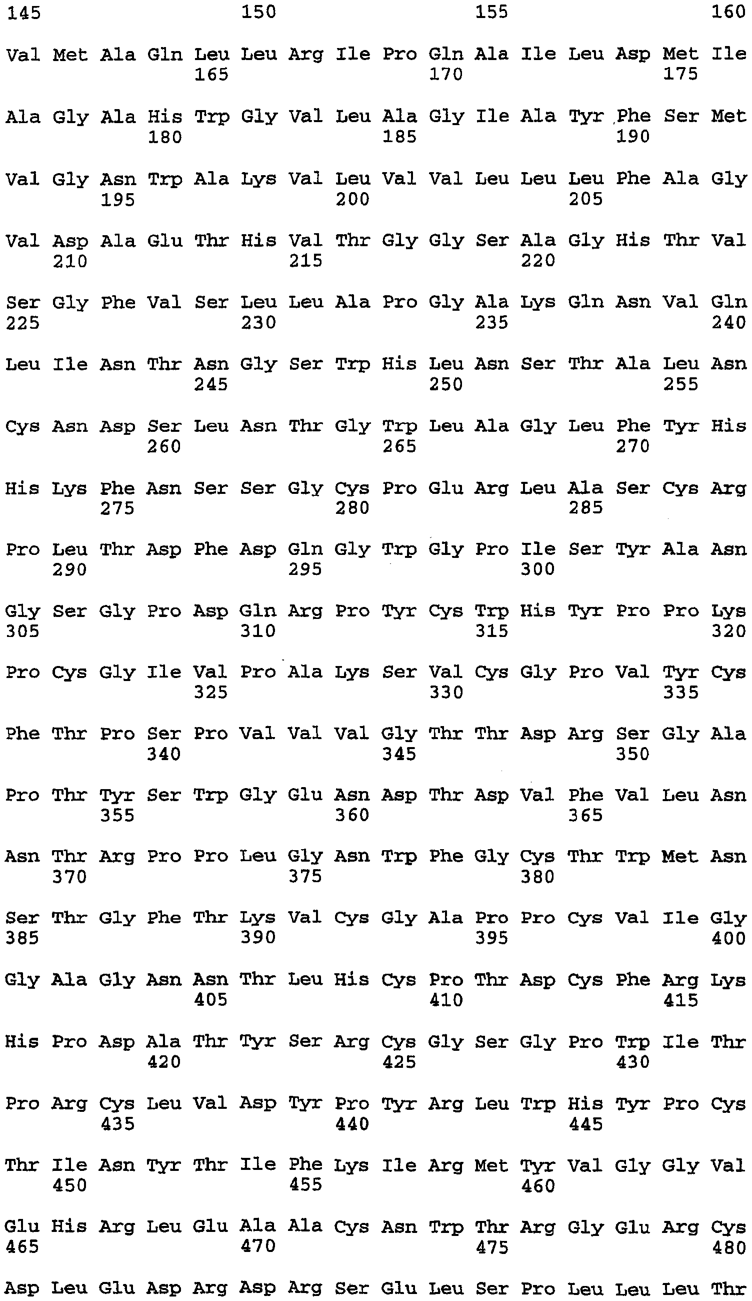 Типичные области E1 и E2 HCV-1 представлены на фигурах 2A-2C и SEQ ID NO:4. В целях настоящего изобретения области E1 и E2 определяют по отношению к номеру аминокислоты полипротеина, кодируемого геномом HCV-1, с первого метионина, обозначаемому как положение 1. Смотри, например, Choo et al., Proc. Natl. Acad. Sci. USA (1991) 88:2451-2455. Однако следует отметить, что применяемый здесь термин «полипептид E1» или «полипептид E2» не ограничивается последовательностью HCV-1. В этом отношении соответствующие области E1 или E2 в других изолятах HCV могут быть легко определены согласованием последовательностей изолятов таким образом, чтобы привести последовательности к максимальному согласованию. Это может быть осуществлено с помощью любого из ряда пакетов компьютерных программ, такого как ALIGN 1.0, имеющегося в распоряжении University of Virginia, Department of Biochemistry (Attn: Dr. William R. Pearson). Смотри Pearson et al., Proc. Natl. Acad. Sci. USA (1988) 85:2444-2448.
