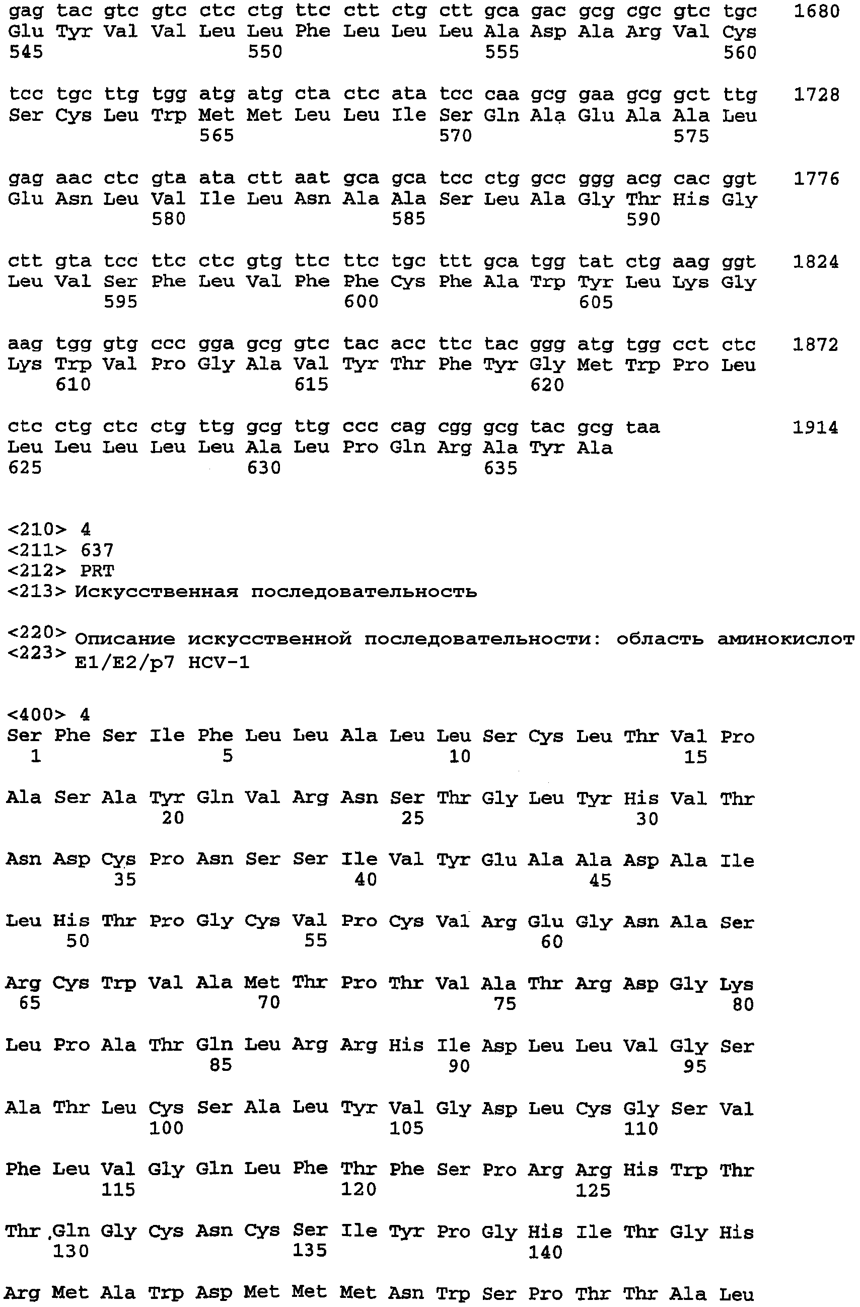 Термином «полипептид E1» обозначают молекулу, происходящую из области E1 HCV. Зрелая область E1 HCV-1 начинается приблизительно с аминокислоты 192 полипротеина и продолжается до приблизительно аминокислоты 383, пронумерованных относительно полноразмерного полипротеина HCV-1 (смотри фигуры 1 и 2A-2C. Аминокислоты 192-383 фигур 2A-2C соответствуют положениям аминокислот 20-211 SEQ ID NO:4). Аминокислоты от около 173 до приблизительно 191 (аминокислоты 1-19 SEQ ID NO: 4) служат сигнальной последовательностью для E1. Таким образом, термином «полипептид E1» обозначают либо предшественник белка E1, включающий сигнальную последовательность, или зрелый белок E1, у которого отсутствует сигнальная последовательность, или даже полипептид E1 с гетерологичной сигнальной последовательностью. Полипептид E1 включает С-концевую последовательность для заякоревания в мембране, которая соответствует приблизительно положениям аминокислот 360-383 (смотри международную заявку № WO 95/04301, опубликованную 15 февраля 1996 г.). Полипептид E1, как здесь определяется, может включать для заякоревания или не включать С-концевую последовательность или ее часть.