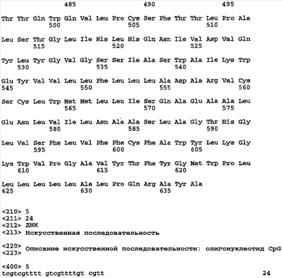 Молекула CpG в любом из осуществлений, представленных выше, может иметь формулу 5′-X1X2CGX3X4, где X1 и X2 представляют собой последовательность, выбранную из группы, состоящей из GpT, GpG, GpA, ApA, ApT, ApG, CpT, CpA, CpG, TpA, TpT и TpG, а X3 и X4 выбраны из группы, состоящей из TpT, CpT, ApT, ApG, CpG, TpC, ApC, CpC, TpA, ApA, GpT, CpA и TpG, где “p” обозначает связь через фосфат. В определенных осуществлениях олигонуклеотид CpG включает последовательность GACGTT, GACGTC, GTCGTT или GTCGCT, с несколькими прилегающими дополнительными нуклеотидами.