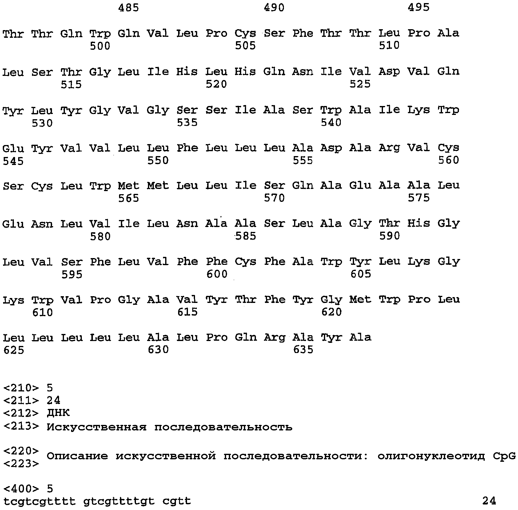 В дополнительном осуществлении олигонуклеотид CpG для применения в композициях настоящего изобретения имеет последовательность 5′-TCCATGACGTTCCTGACGTT-3′ (SEQ ID NO:1) или последовательность 5′-TCGTCGTTTTGTCGTTTTGTCGTT-3′ (SEQ ID NO:5).