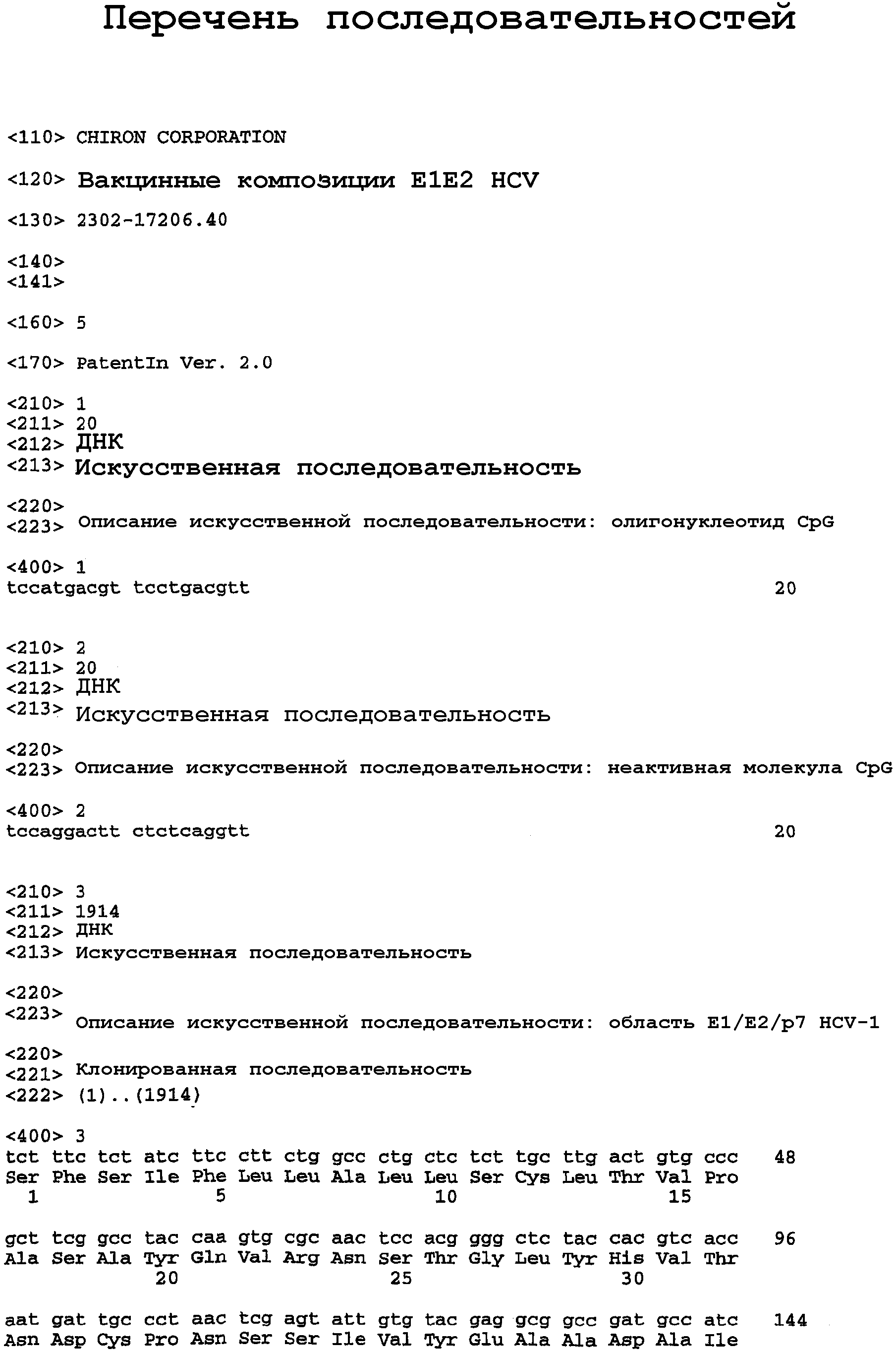 Составы, примененные в данном исследовании, суммированы в таблице 2. MF59 и E1E2809 описаны выше. Последовательность примененной молекулы CpG была следующей: 5′-TCGTCGTTTTGTCGTTTTGTCGTT-3′ (SEQ ID NO:5).