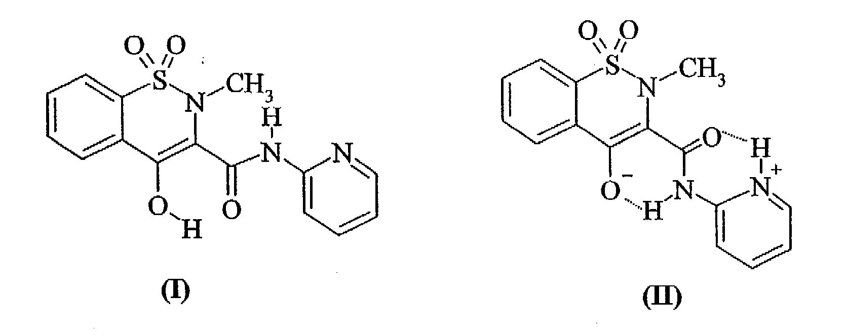 Переработка пироксикама осложнена из-за возможных таутомерных переходов и полиморфизма. В самом деле, указанная молекула может существовать в двух полиморфических формах, и , которые имеют одинаковую интрамолекулярную структуру EZE (I), но различные характеристики интра- и интермолекулярных взаимодействий водородной связи, и в псевдополиморфе, который является гидратом цвиттерионной формы ZZZ, одна из возможных резонансных форм которого представлена формулой (II) (Reck et al., Pharmazie 1988, 43, 477; Bordner et al., Acta Crystallogr. 1984, C40, 989),