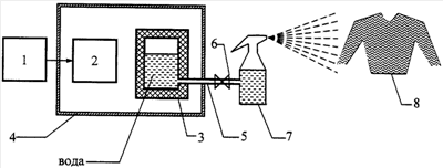 Блок-схема содержит генератор низкой частоты 1 (1-300 Гц), соединенный с излучателем 2. Излучатель 2 и резервуар для обрабатываемой жидкости (воды) 3, который представляет собой емкость из неэлектропроводящего материала, помещены внутри экранированной камеры 4. Резервуар 3 соединен трубопроводом 5, снабженным краном 6, с опрыскивателем 7. 8 – обрабатываемая одежда.
